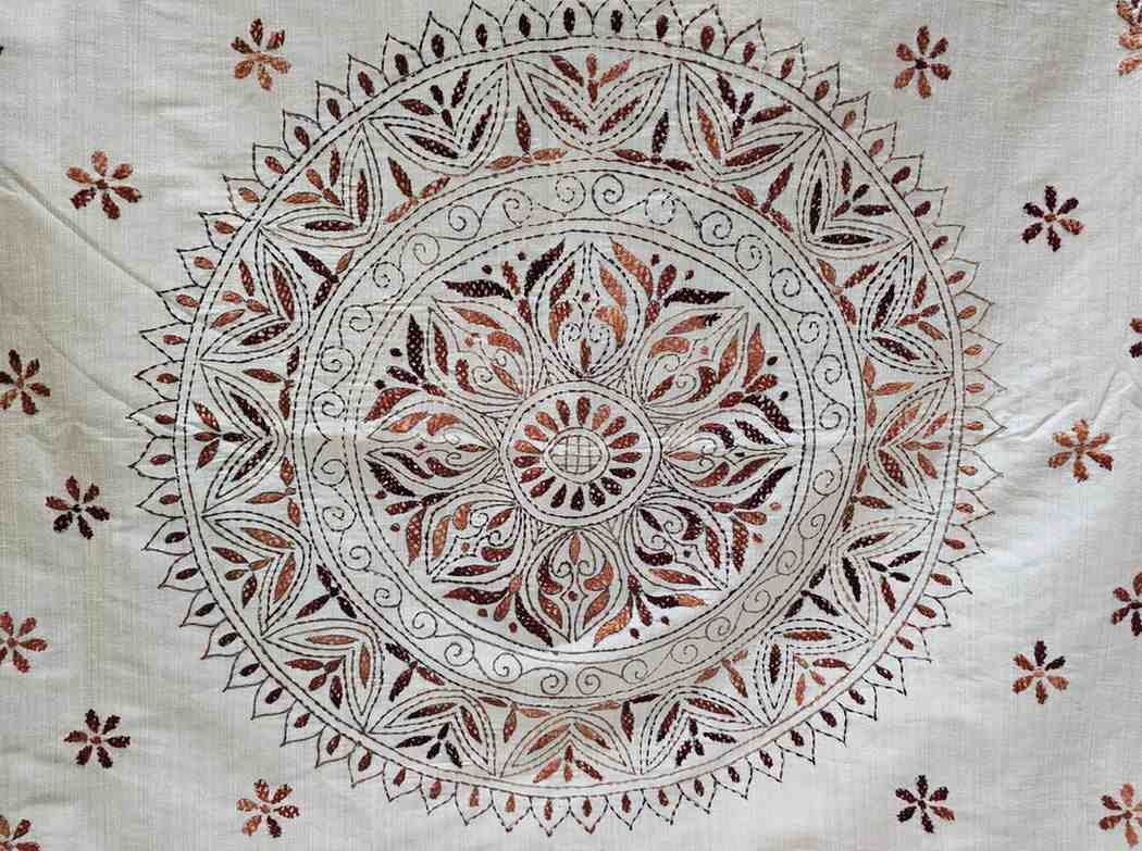 Color: Warm Brown Base with Intricate Hand Stitched Motifs