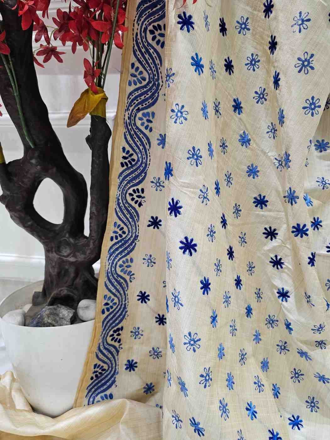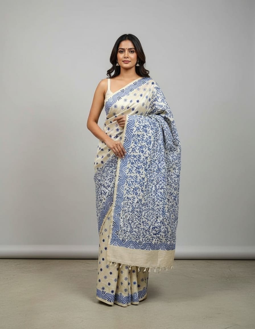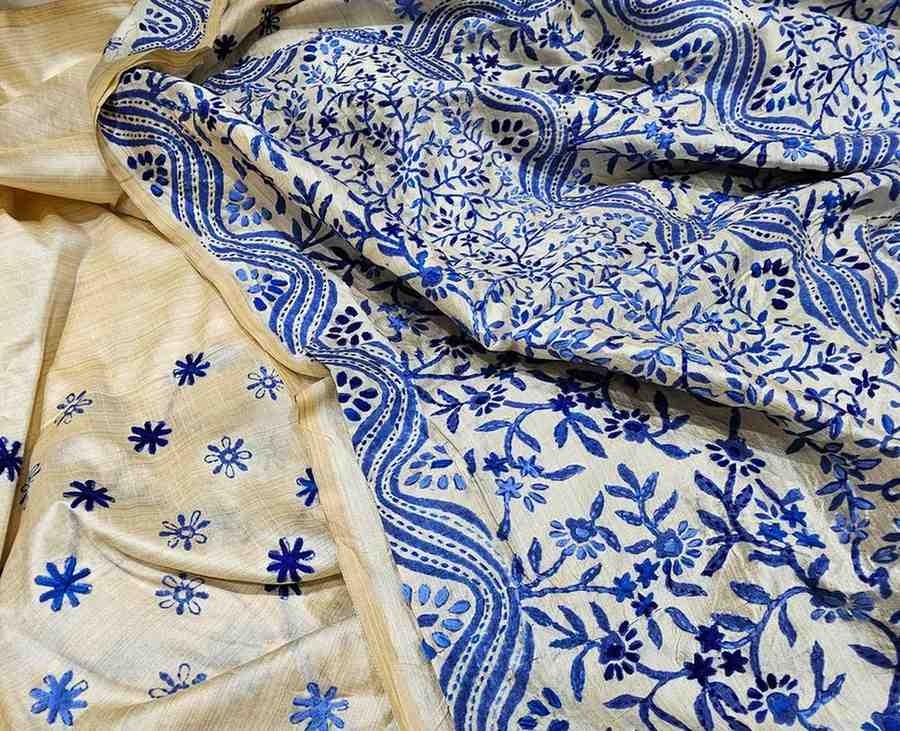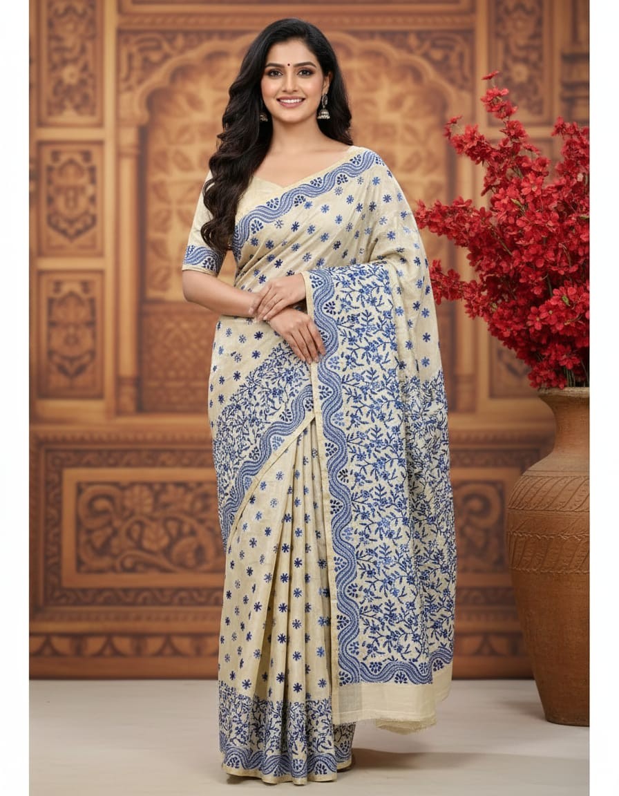 Immerse yourself in the beauty of traditional artistry with the Hand Stitched Kadhwa Kantha Saree - Blue. The vibrant blue fabric forms the perfect backdrop for the intricate Kadhwa Kantha embroidery, with each hand-stitched motif crafted with care and precision. The Kadhwa Kantha technique is known for its exquisite detailing and rich texture, creating a stunning visual effect that elevates the saree’s beauty. This saree is perfect for weddings, cultural celebrations, or formal events, offering a timeless, classic appeal with a modern twist. The deep blue hue combined with the intricate embroidery makes this saree a perfect blend of elegance and heritage.