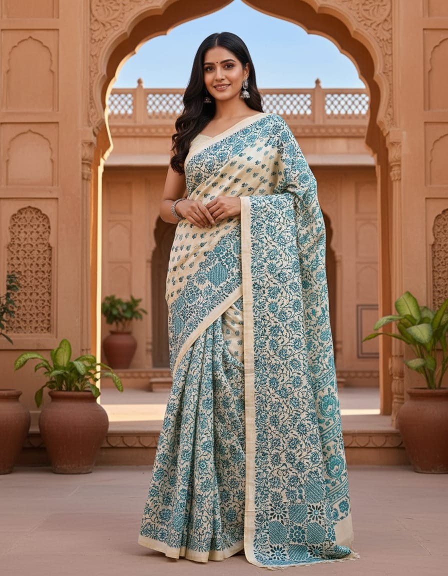 Indulge in timeless elegance with the Hand Stitched Kadhwa Kantha Saree - Tiffany Blue. The serene Tiffany Blue base creates a soothing yet sophisticated backdrop for the intricate Kadhwa Kantha embroidery. Each motif is meticulously hand-stitched, adding texture and depth to the fabric, making it a true masterpiece of craftsmanship. The subtle yet striking blue hue offers a refreshing charm, making this saree perfect for weddings, formal gatherings, and special occasions. This saree beautifully blends traditional techniques with contemporary grace, ensuring a look of elegance and refinement.
