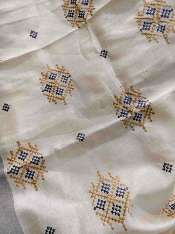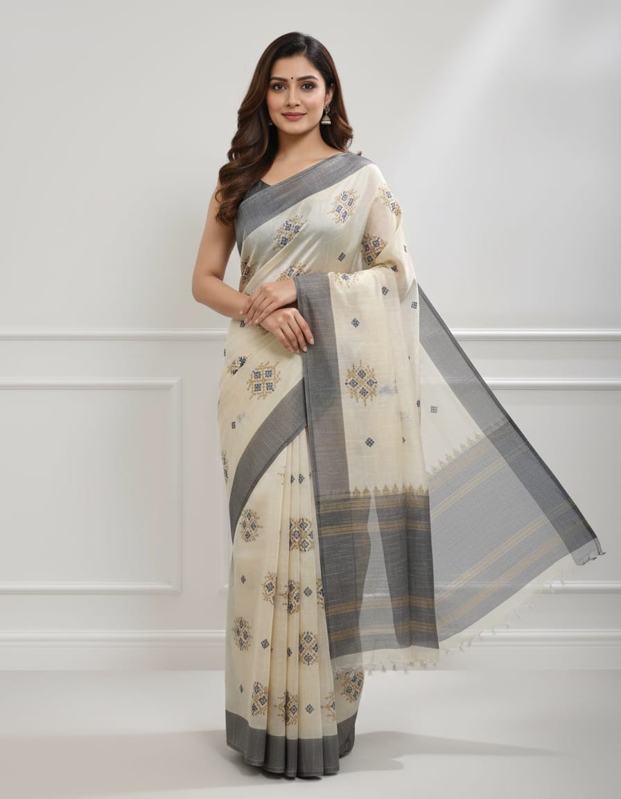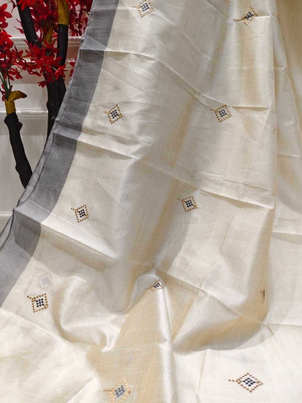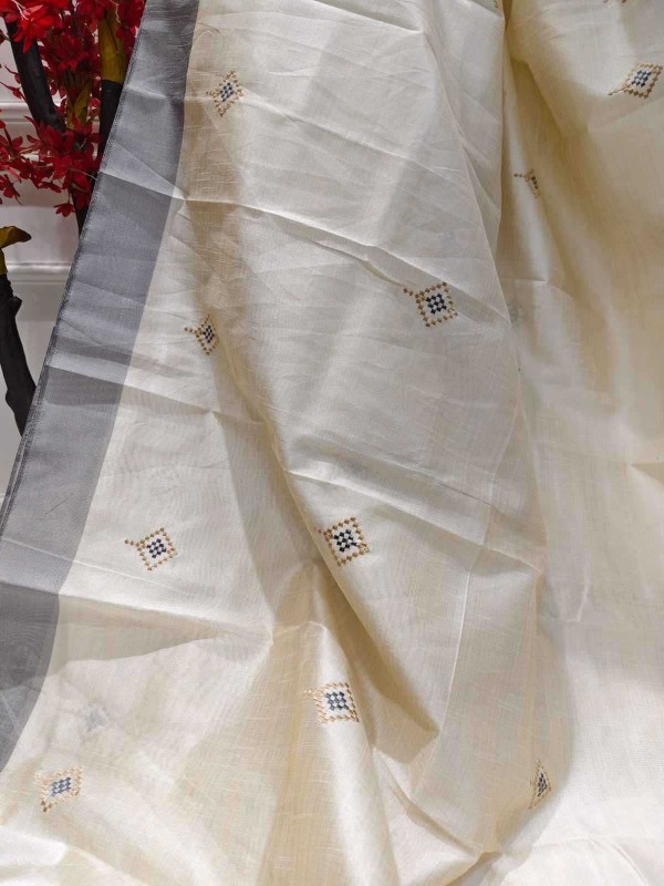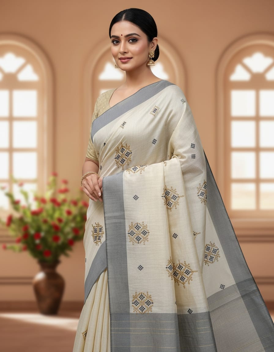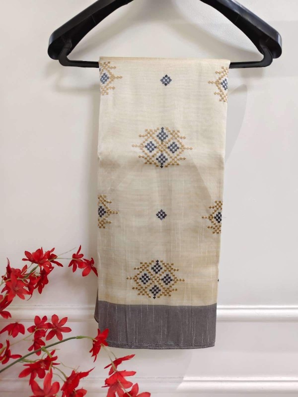 our Hand Stitched Matka Silk Saree adorned with intricate Rangoli Designs and a sophisticated Grey Border. Made from richly textured Matka silk, this saree reflects understated luxury and