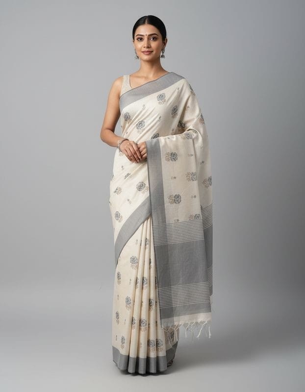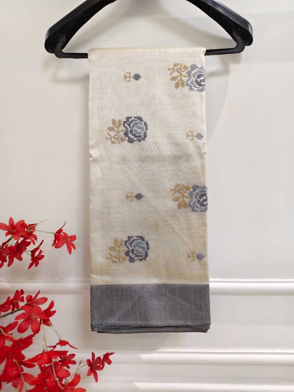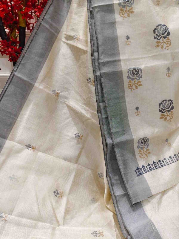 Hand Stitched Matka Silk with Grey Border – Rose Design