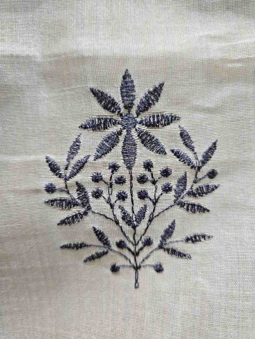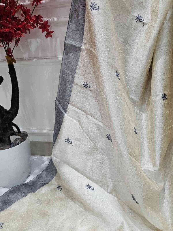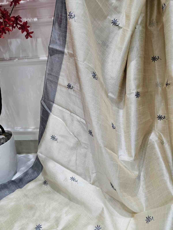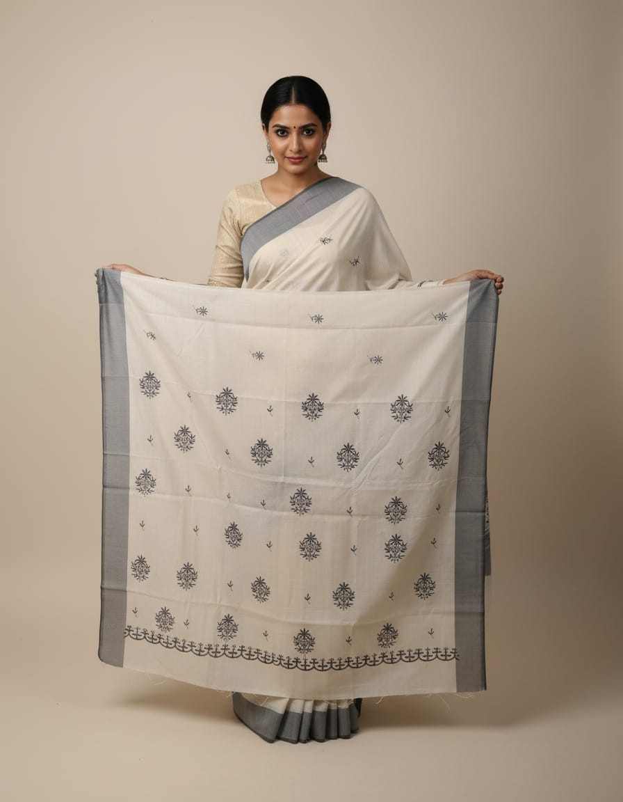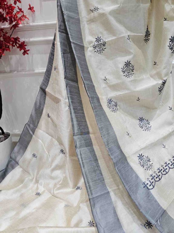 Hand Stitched Matka Silk with Grey Border – Floral Design