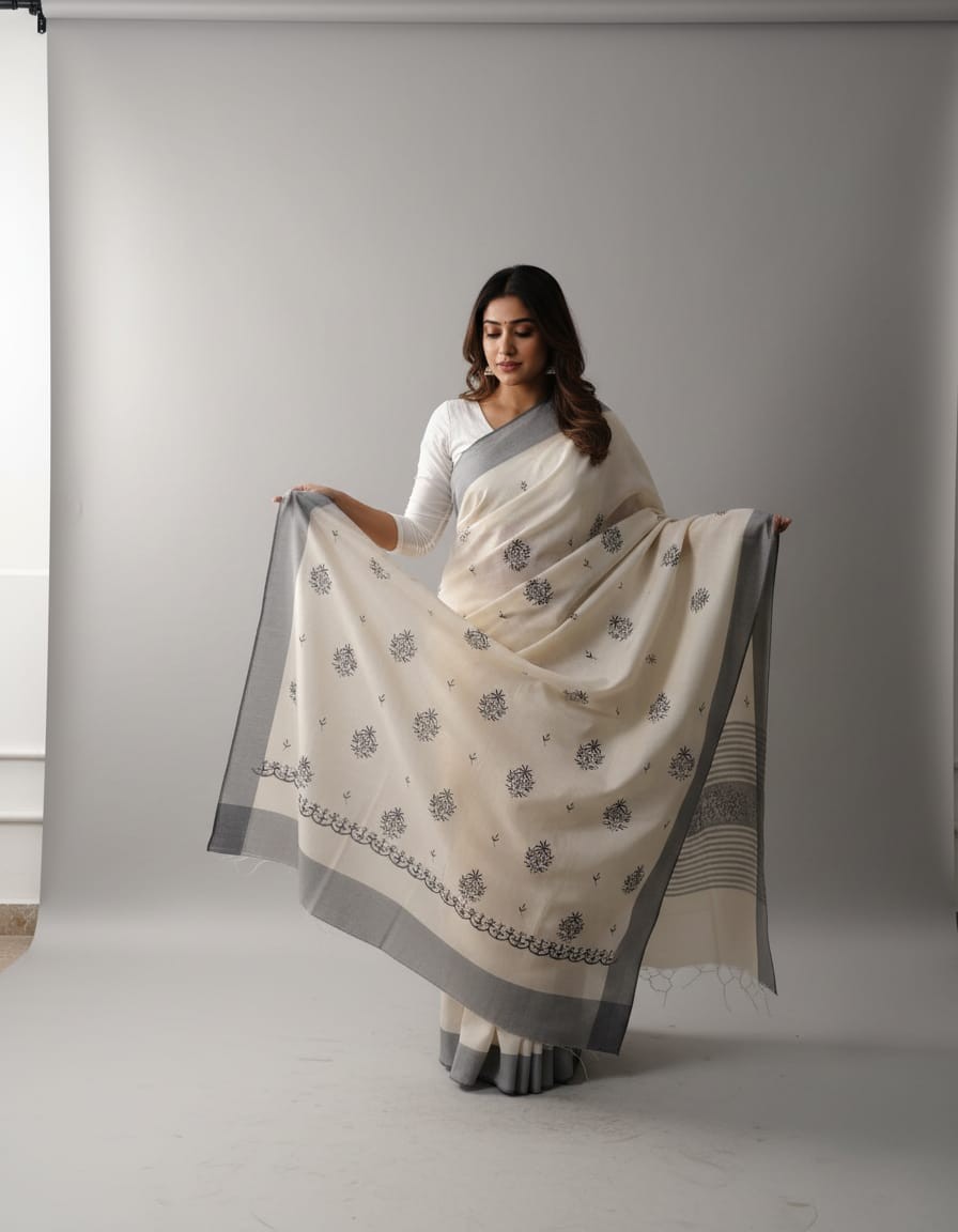 Timeless beauty meets handcrafted elegance in our Hand Stitched Matka Silk Saree adorned with intricate Floral Designs and a sophisticated Grey Border. Made from richly textured Matka silk, this saree reflects understated luxury and heritage charm. The delicate hand-stitched floral patterns bring a soft, artistic touch, while the grey border adds depth and balance to the design. Ideal for festive gatherings, artistic events, or elegant daywear, this saree is a tribute to nature’s grace and traditional craftsmanship.