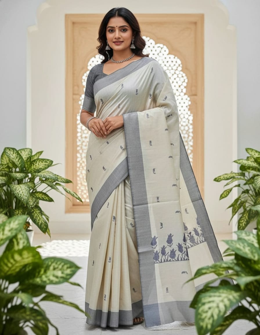 Elevate your ethnic collection with the refined charm of our Hand Stitched Matka Silk Saree, beautifully detailed with elegant Tulip Designs and a classic Grey Border. Woven from natural-textured Matka silk, this saree is celebrated for its organic feel and understated luxury. The hand-embroidered tulip motifs add a touch of floral grace, symbolizing elegance and renewal, while the subtle grey border provides a contemporary edge. Perfect for intimate celebrations, cultural functions, or artistic affairs, this saree is a serene expression of traditional artistry and modern taste.