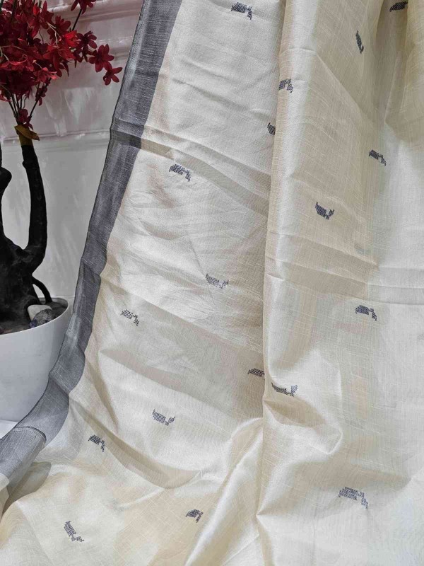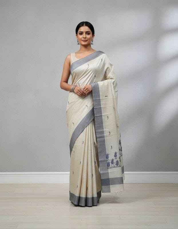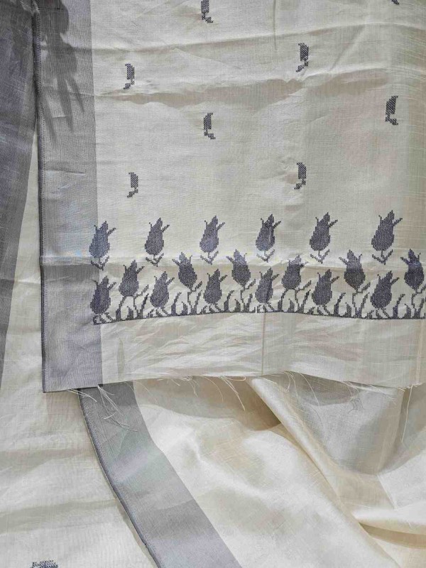 Hand Stitched Matka Silk with Grey Border – Tulip Design