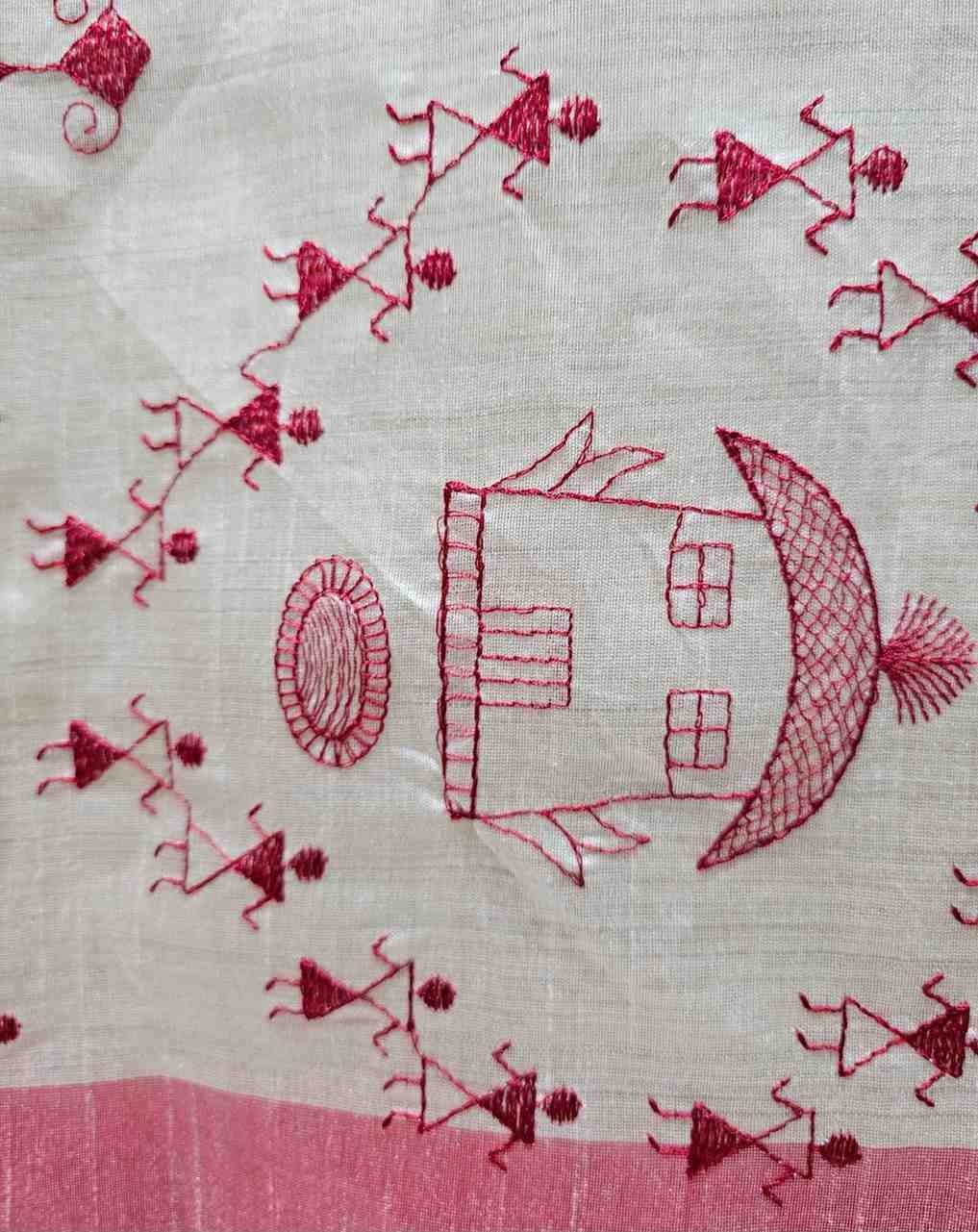 Hand Stitched Matka Silk with Warali Design – Pink, Green, Red