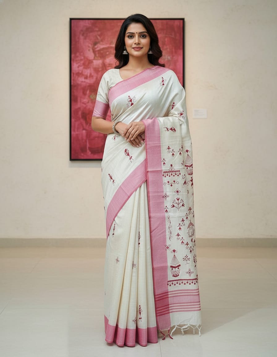 Color: Natural Matka Silk Base with Colorful Warali Design