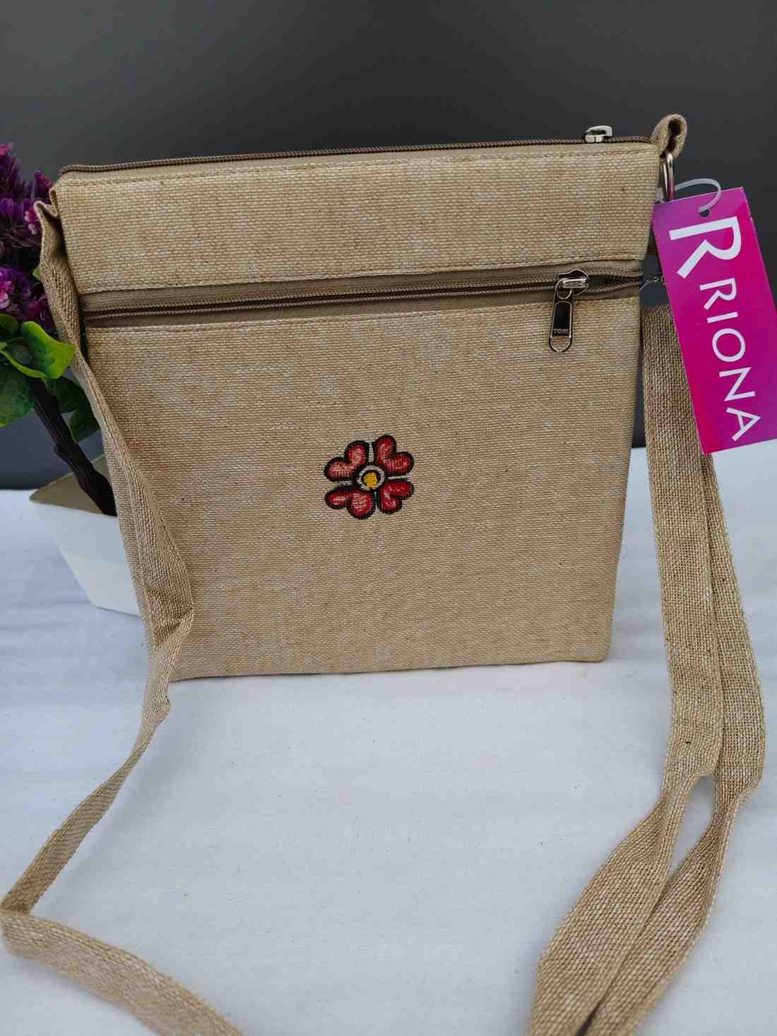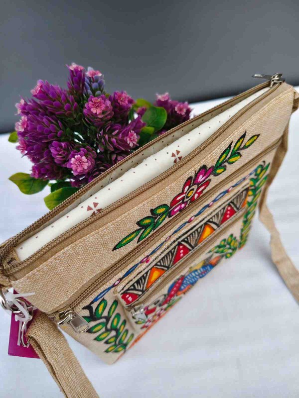 Handpainted Madhubani Double Chain Jute Small Sling Bag - Parrot Design