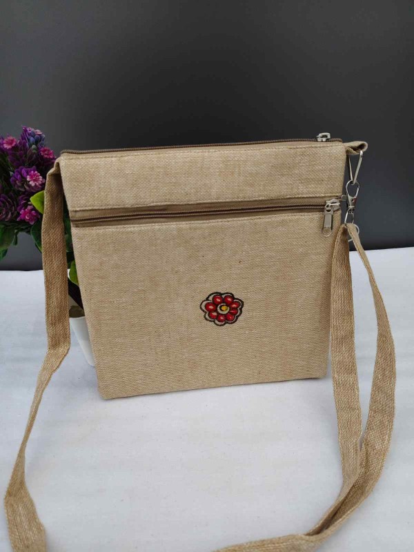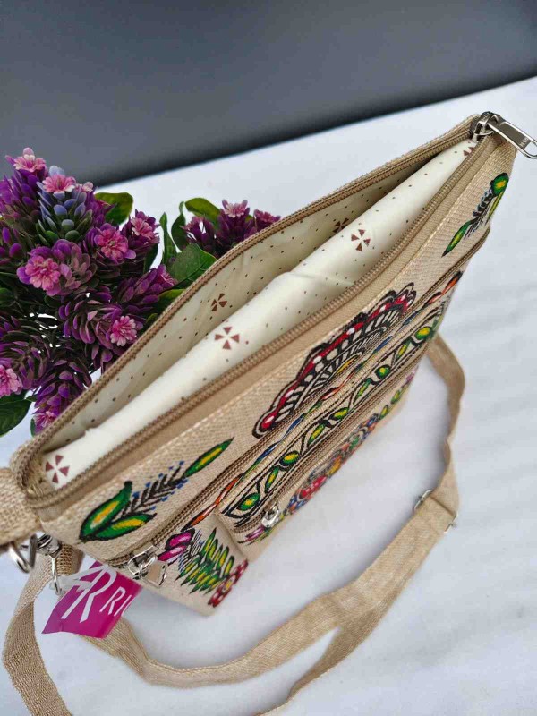 Handpainted Madhubani Double Chain Jute Small Sling Bag - Round Fish Design