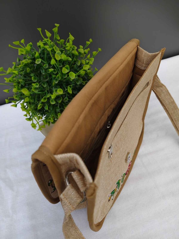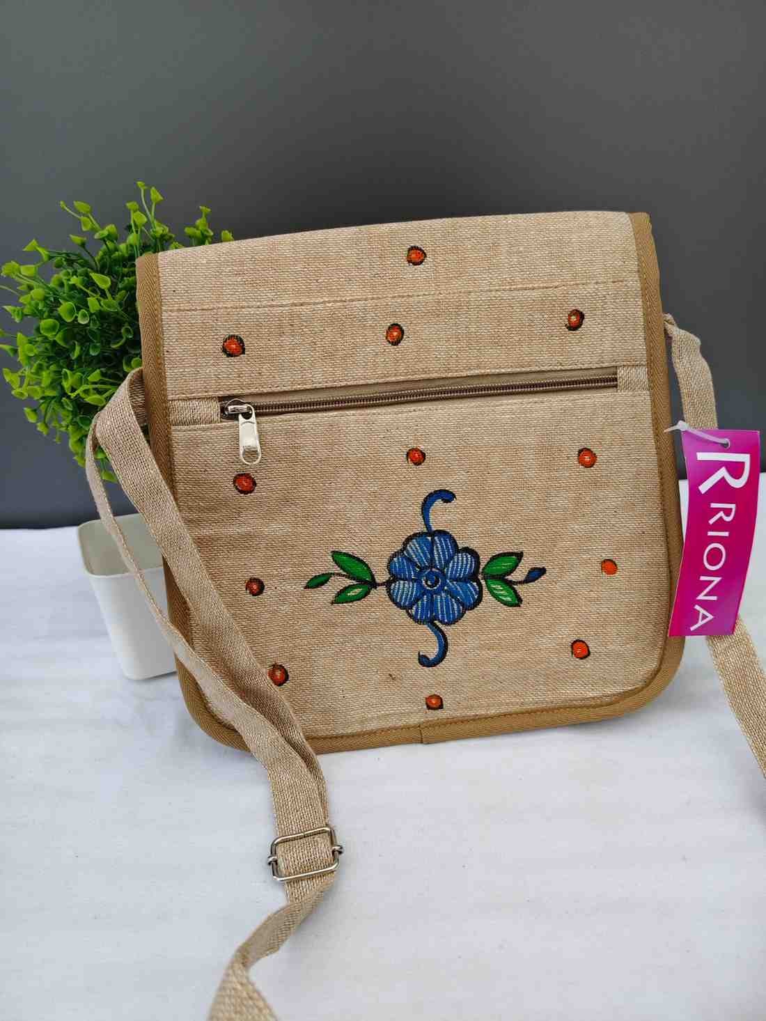 Handpainted Madhubani Jute Round cut Sling Bag - Blue Peacock Design