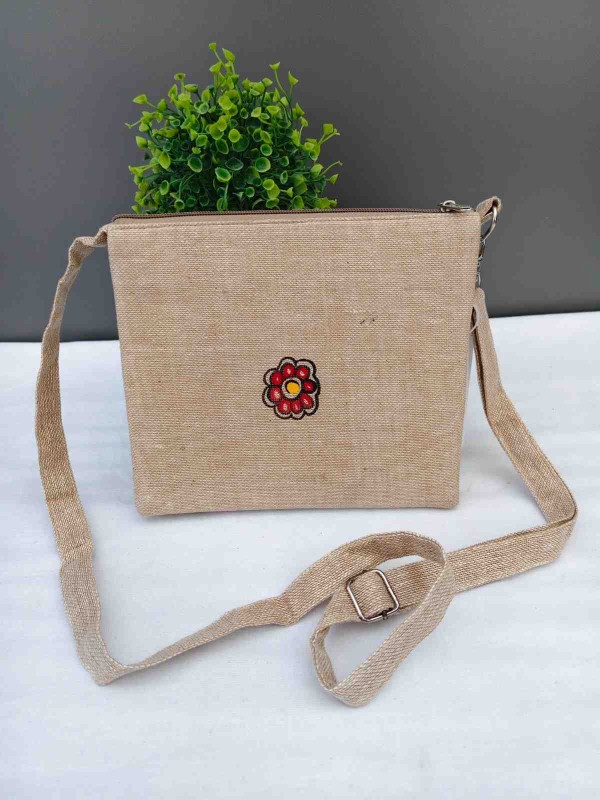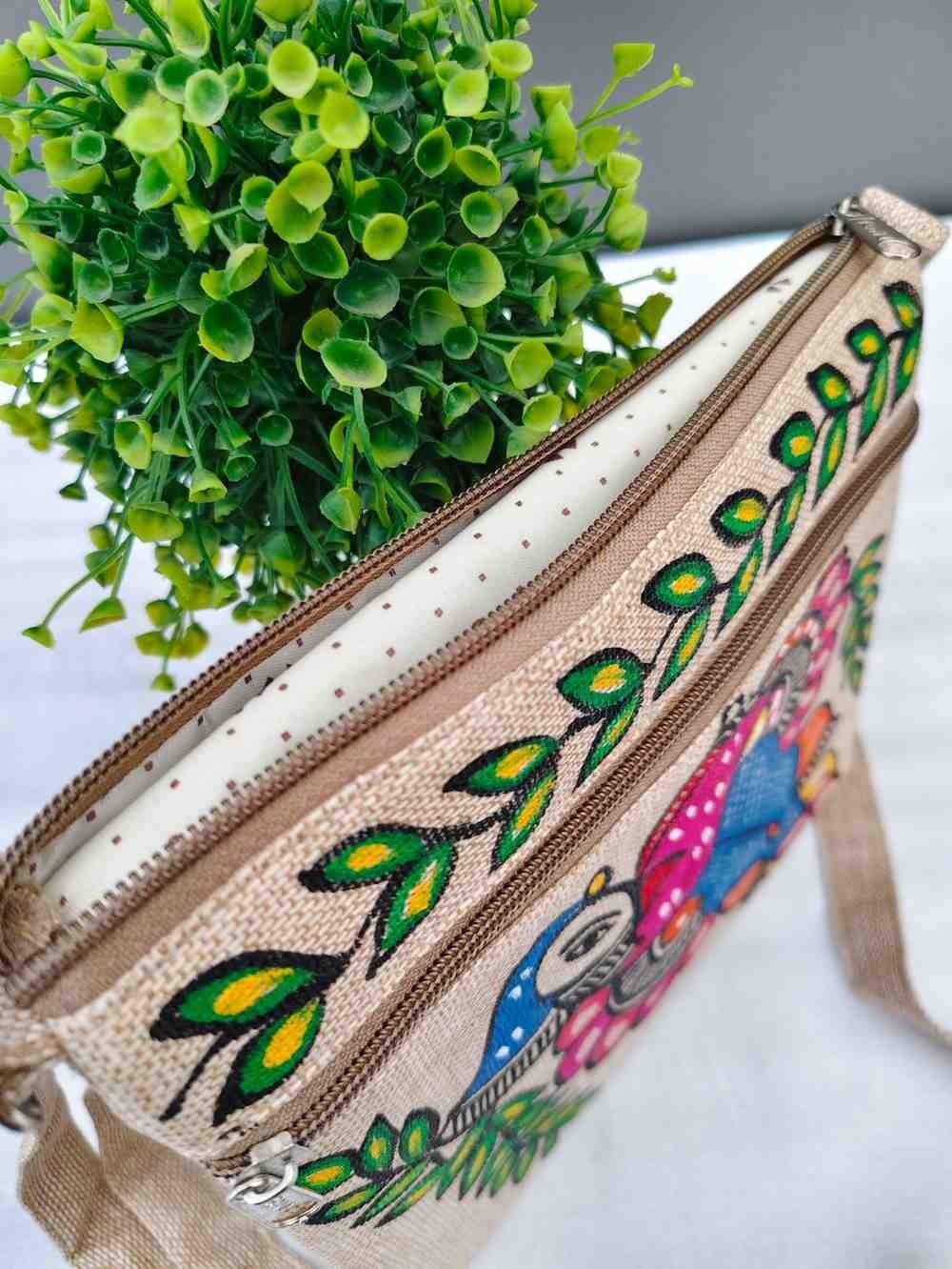 Handpainted Madhubani Jute Small Sling Bag - Peacock Design