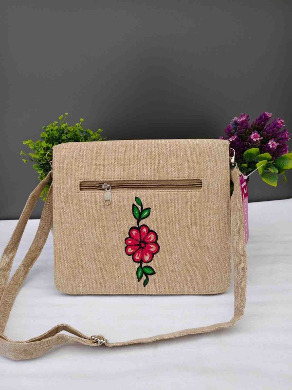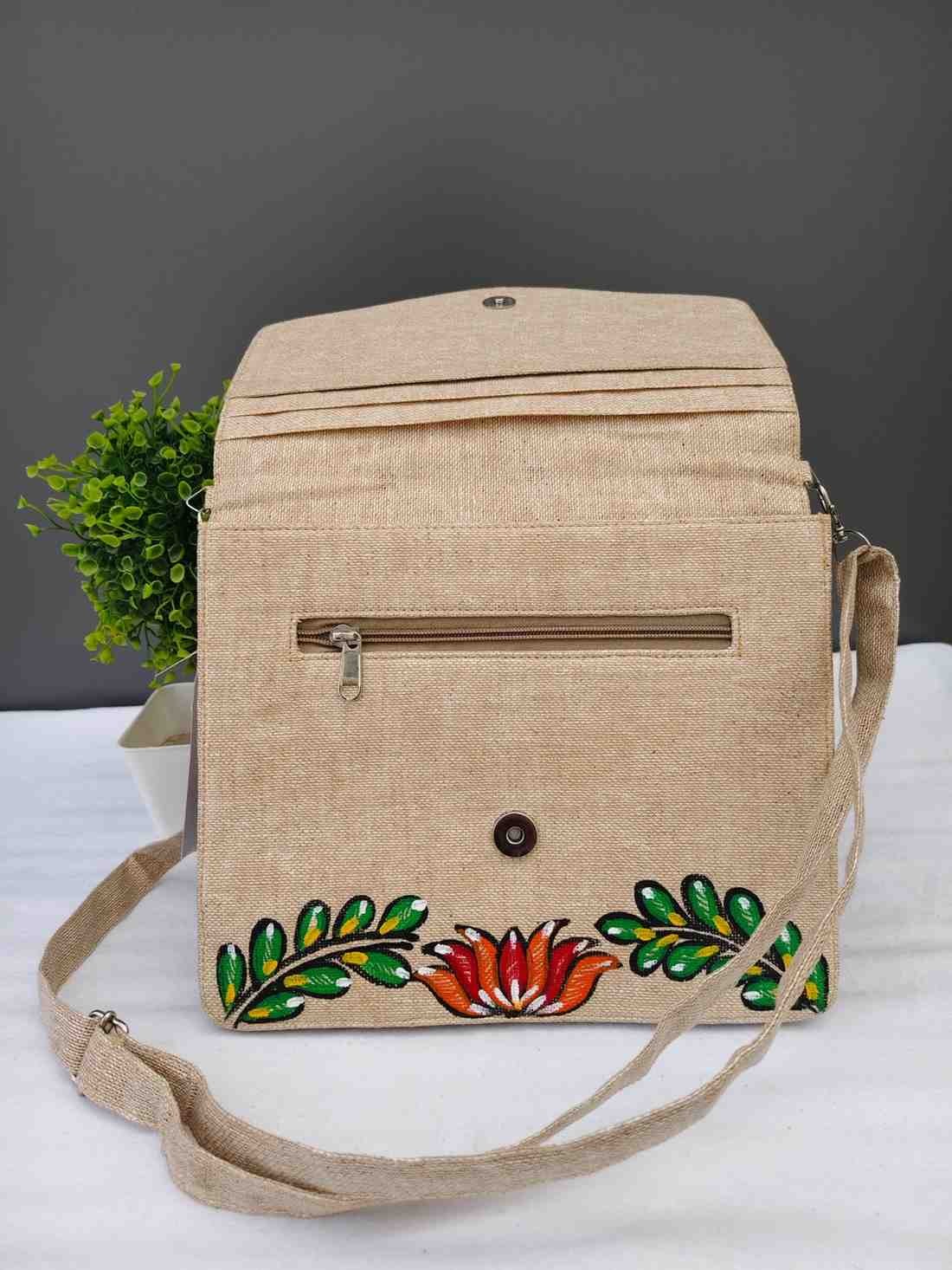Handpainted Madhubani Jute V cut Sling Bag - Bird Design