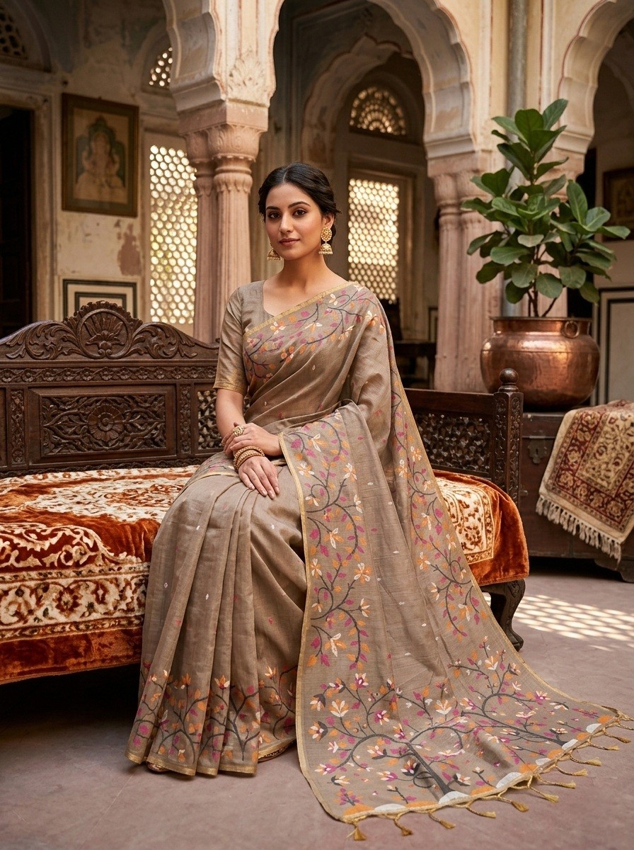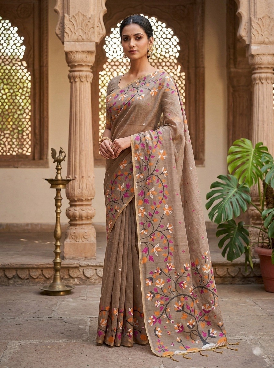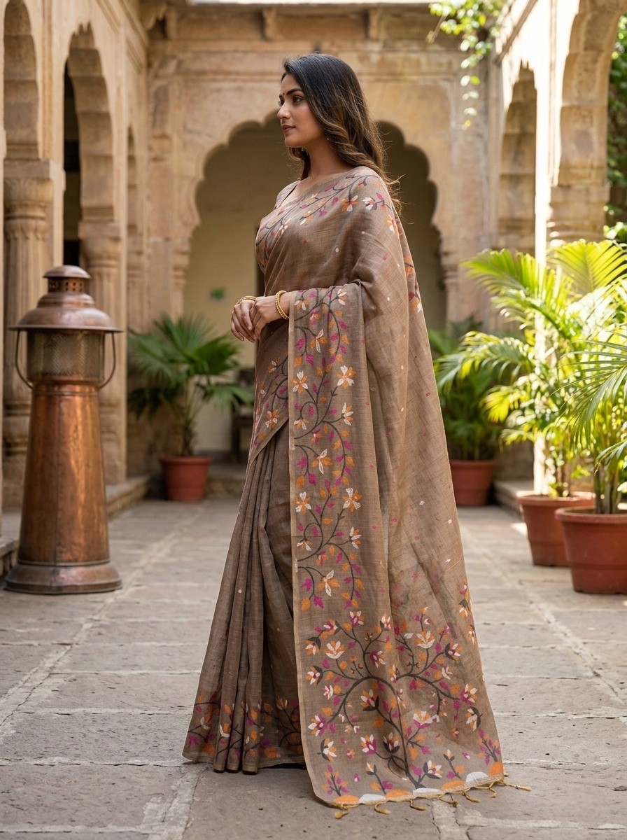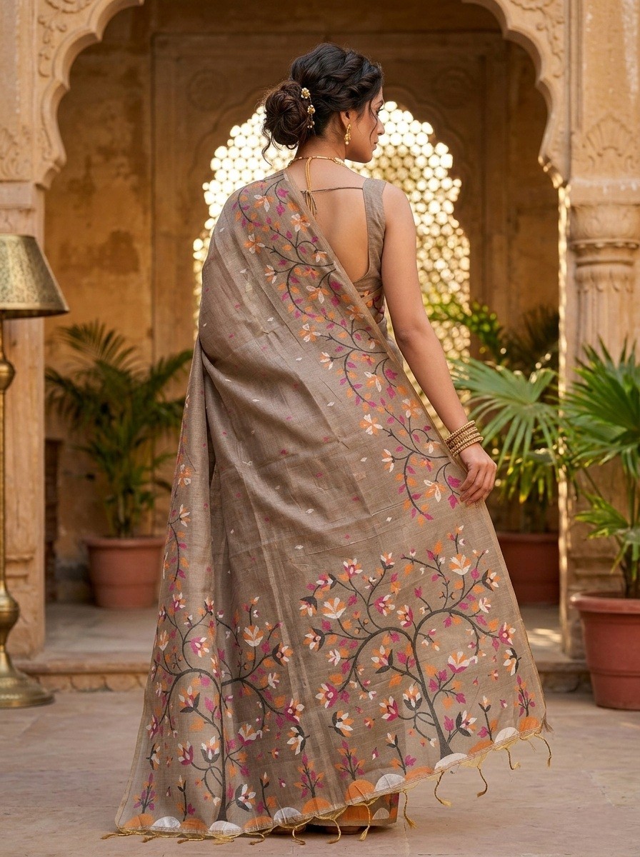 Rustic Flora Muga Jamdani Saree-Light Brown