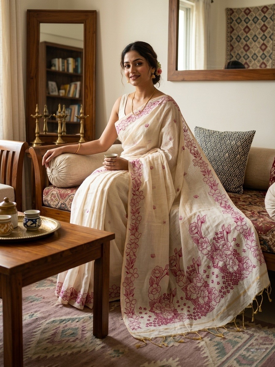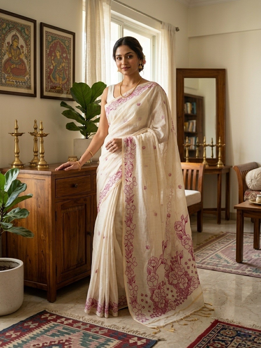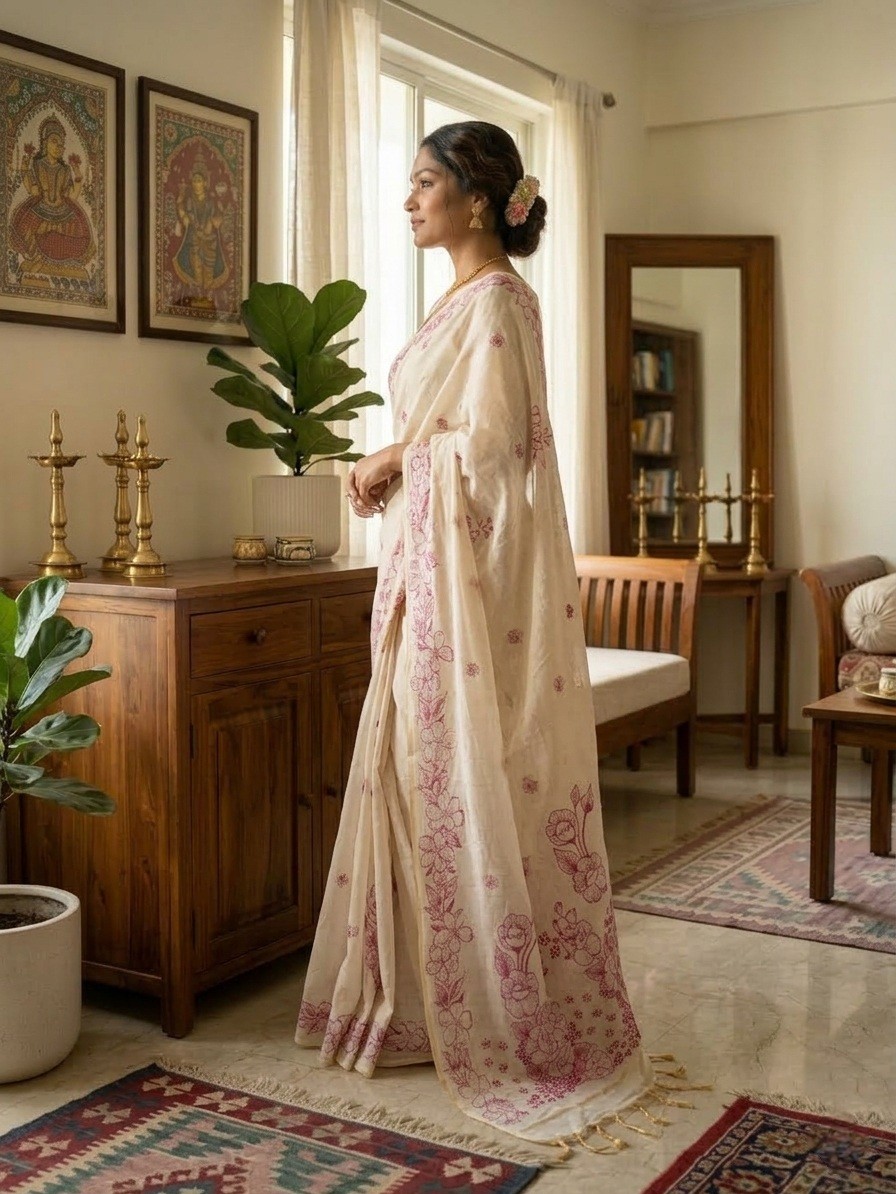 Embrace the beauty of tradition with our The Gulabi Bela muga Jamdani Saree, featuring a serene base adorned with exquisite Pink Blossom Motifs. Woven from the finest Muga silk, this saree reflects the luxurious texture and natural sheen that the fabric is renowned for. The Pink blossoms beautifully pop against the soft base, creating a perfect balance of vibrancy and elegance. Ideal for weddings, cultural events, or festive occasions, this saree is a true embodiment of timeless craftsmanship and sophisticated style.