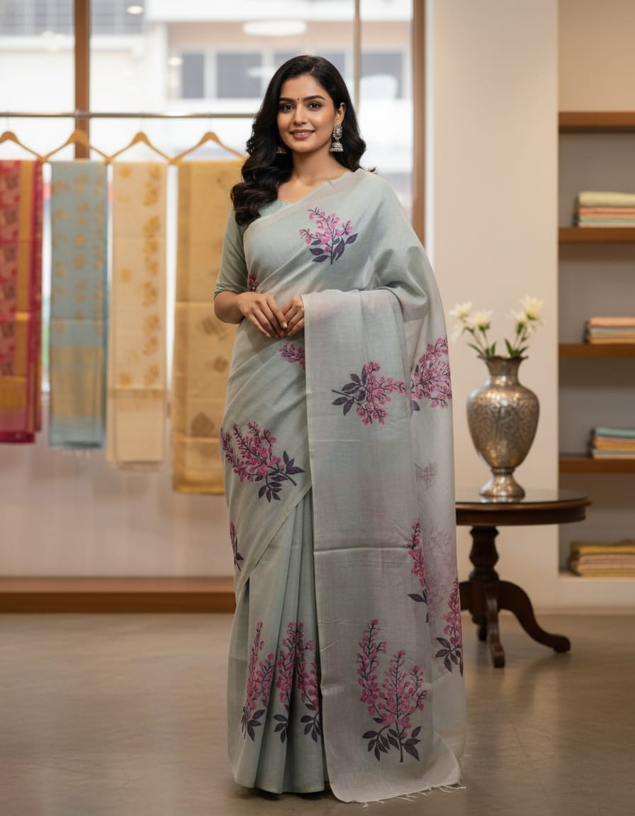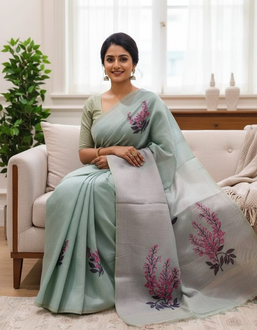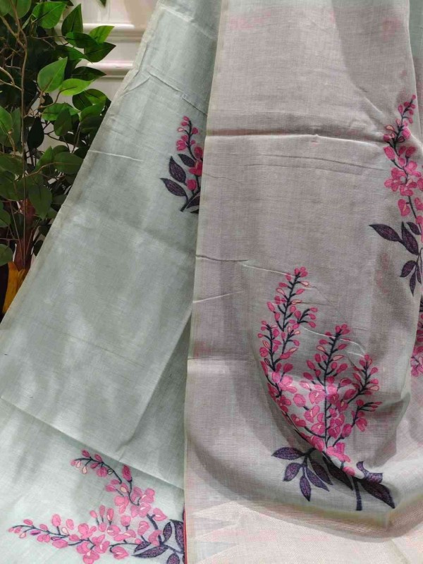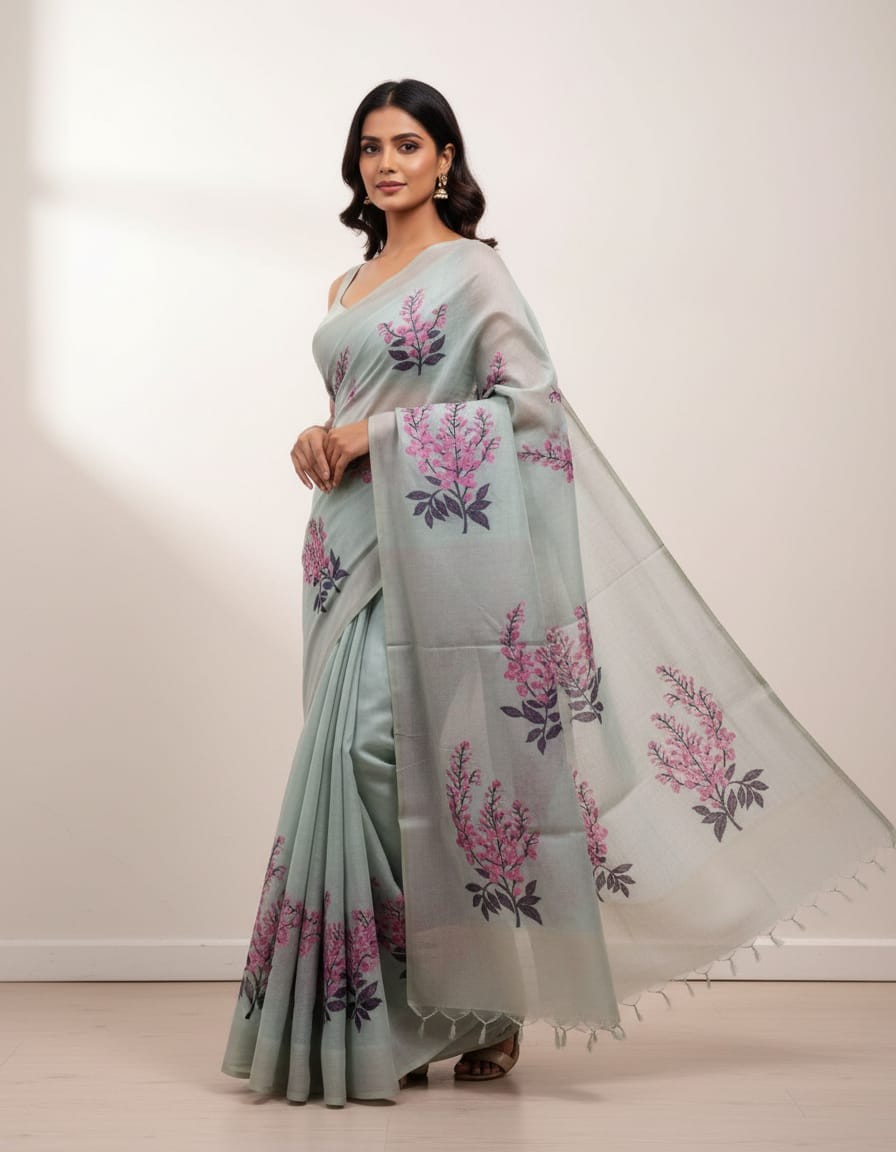 Floral Art Muga Jamdani Saree Green With Pink Blossom