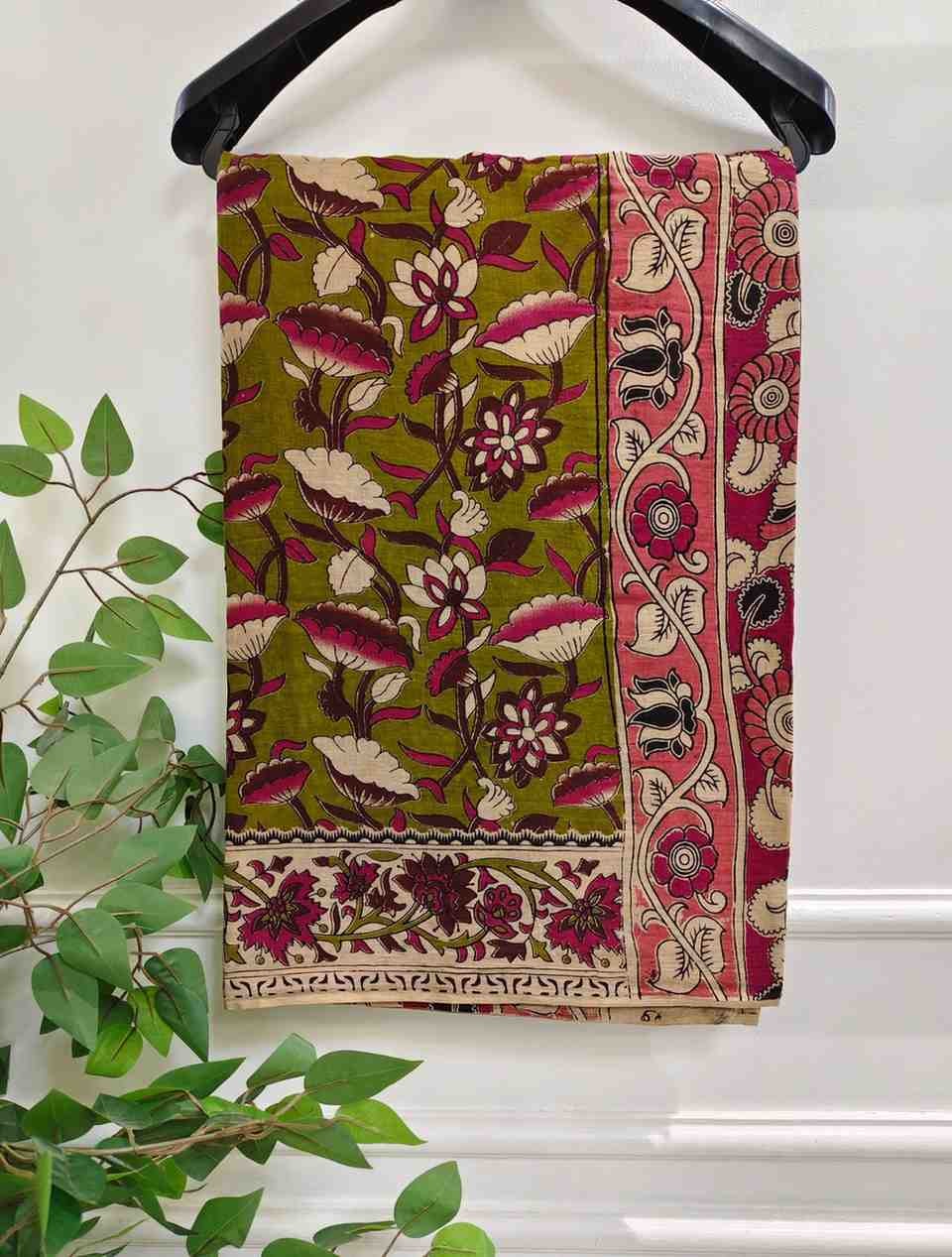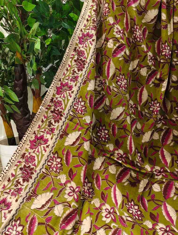 'Kamalamala' Olive Green canvas cotton Kalamkari Saree