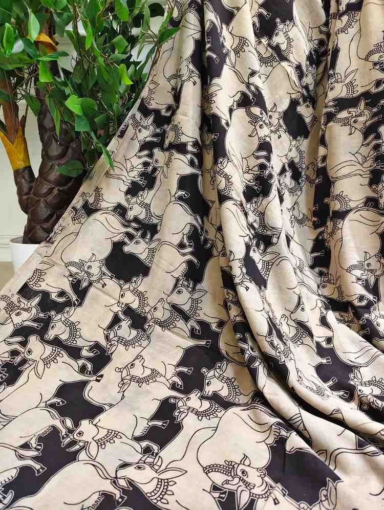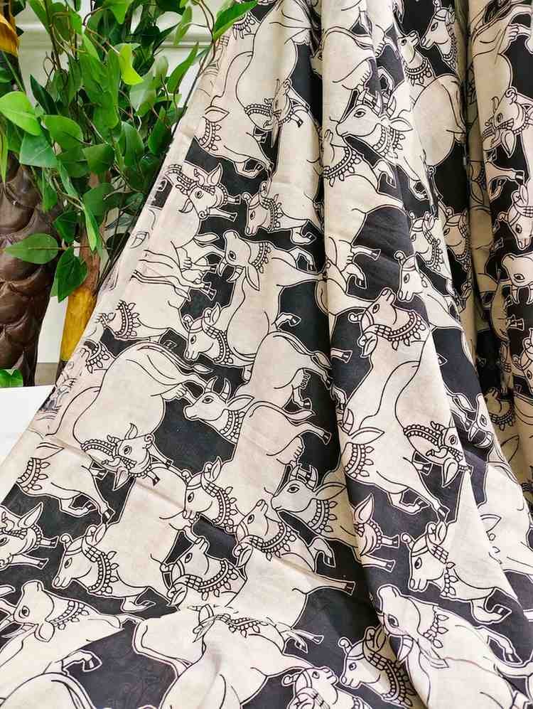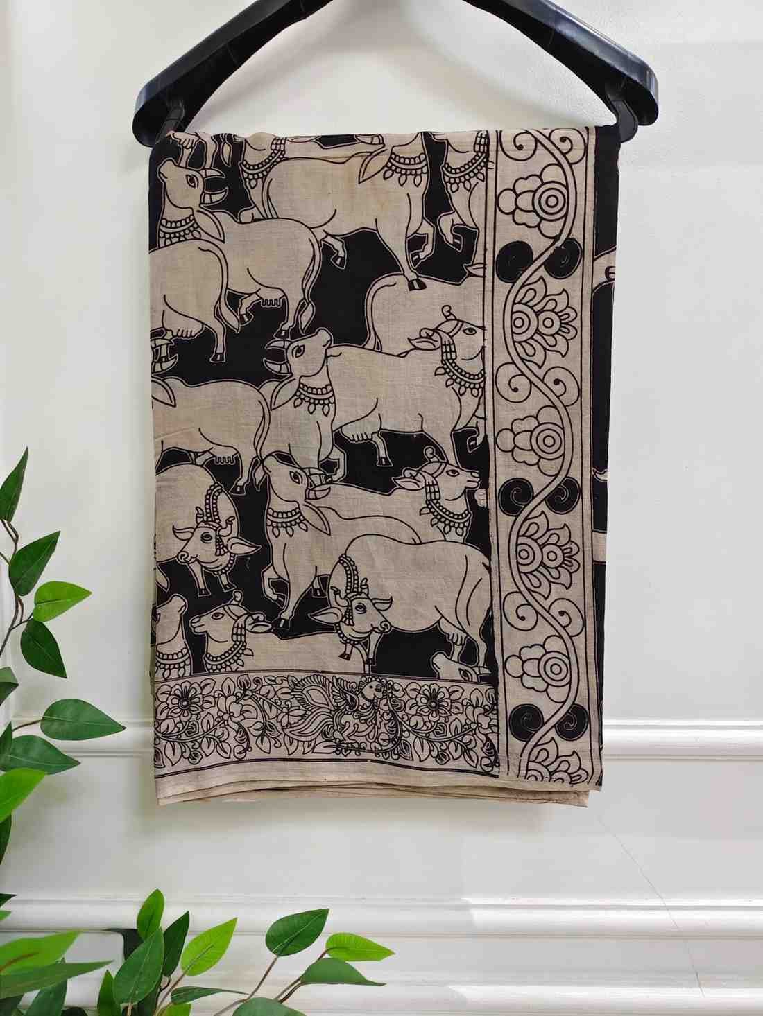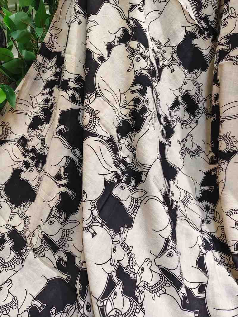 'Kamdhenu' Black canvas with Cow design cotton Kalamkari Saree