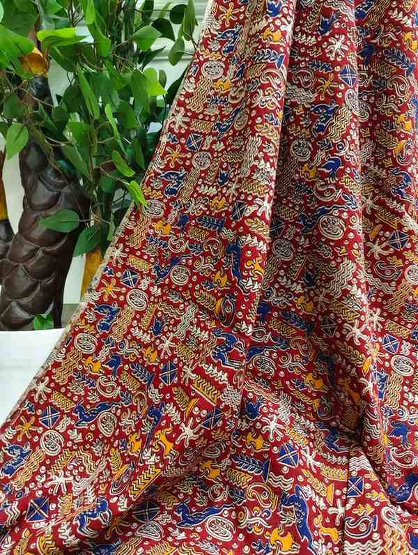 'Karṇika' Rust red with Tribal patterns cotton Kalamkari Saree