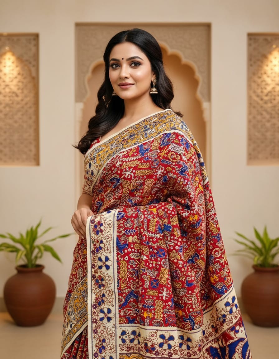 • Kalamkari sarees are sun-dried in open agricultural fields, which may result in minor dust marks — a testament to their authenticity. We recommend washing before first use.