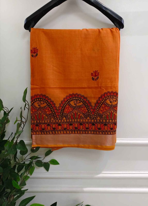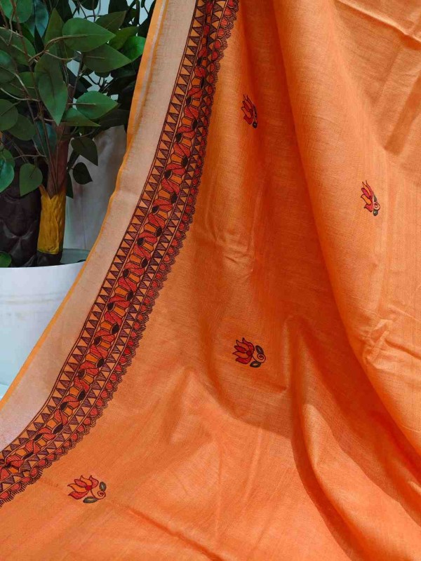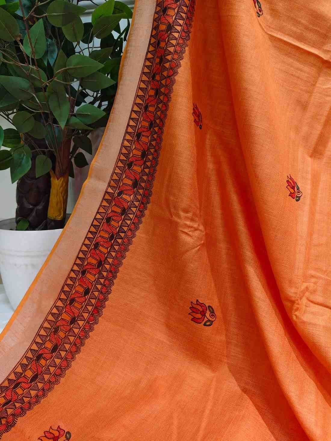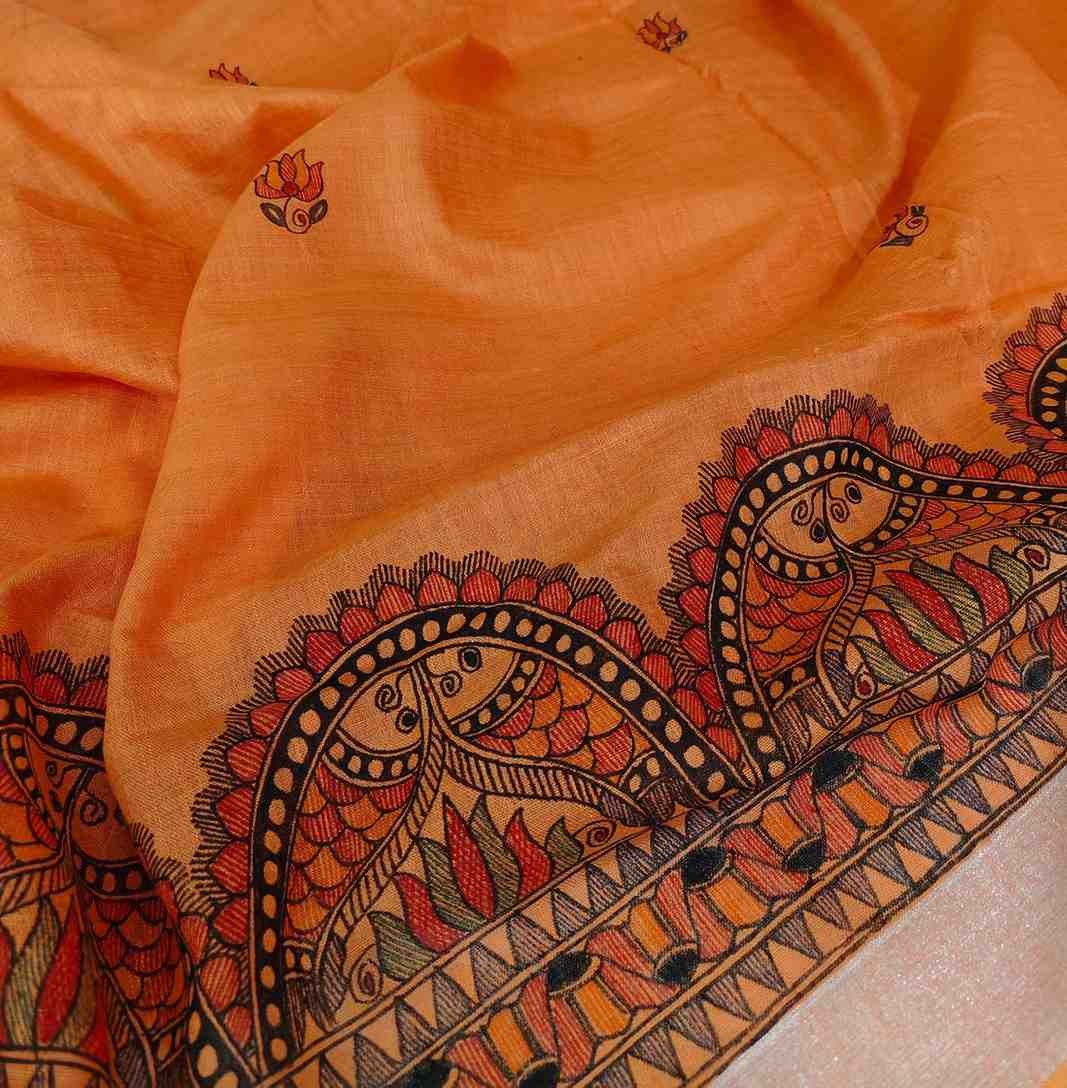 Kesarimayura Orange Hue Hand painted Madhubani Blend Saree