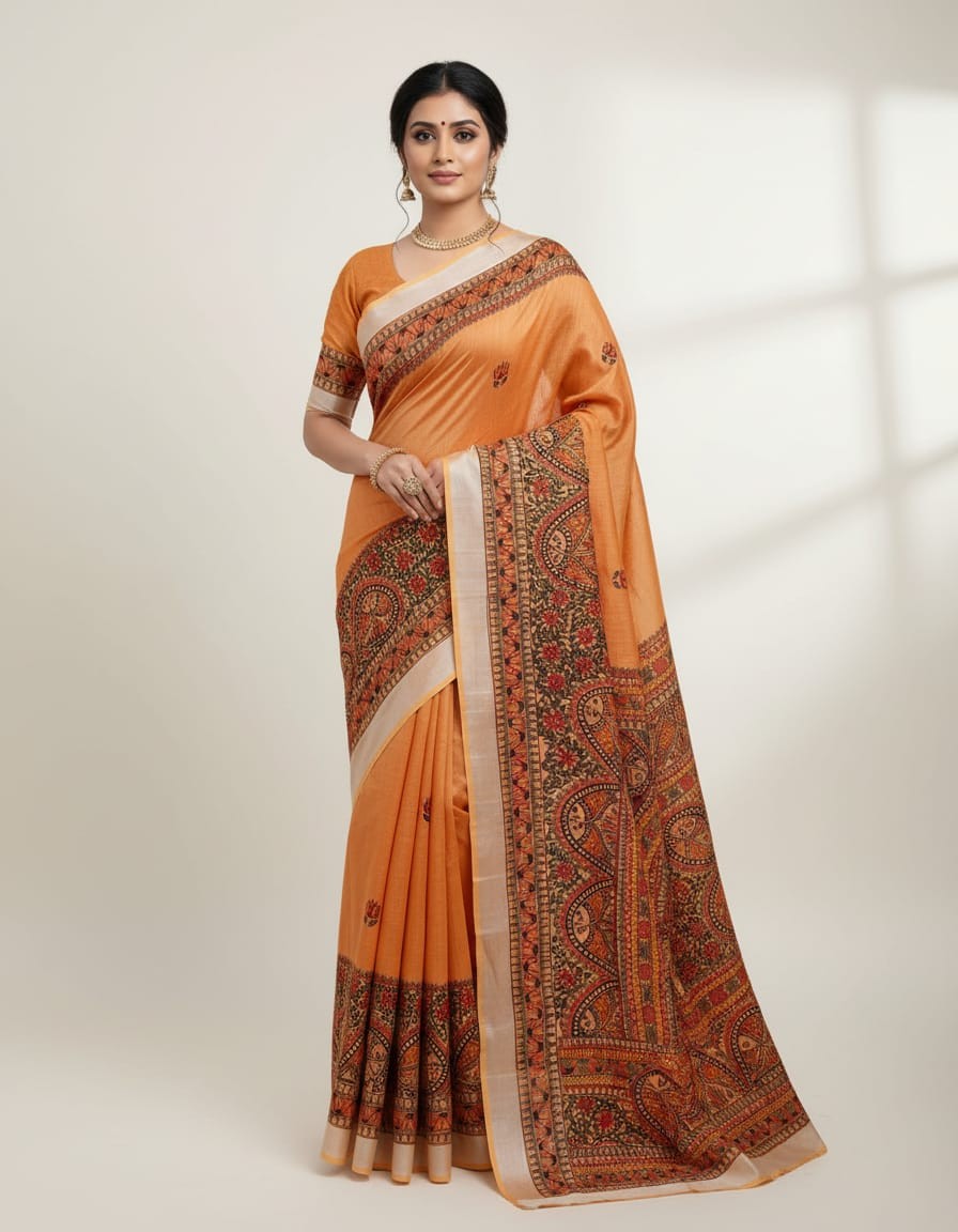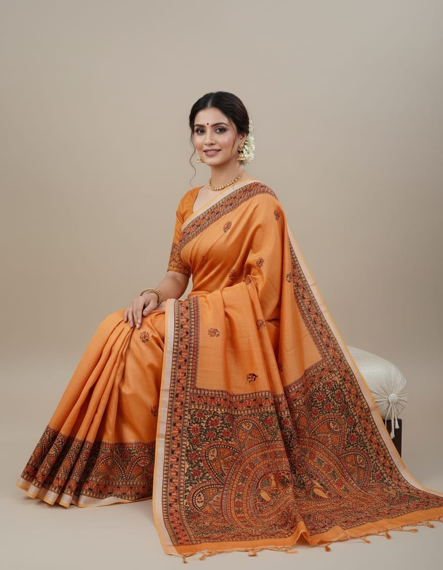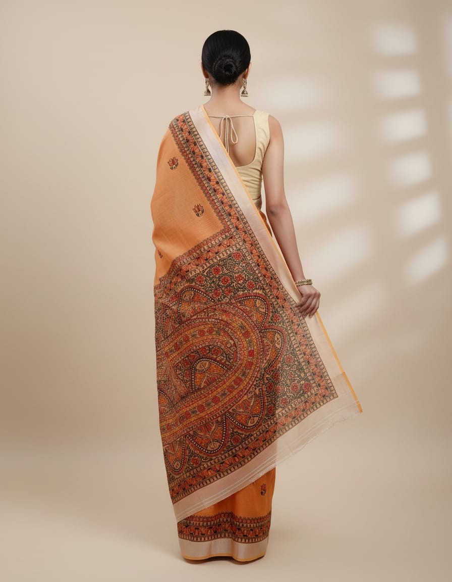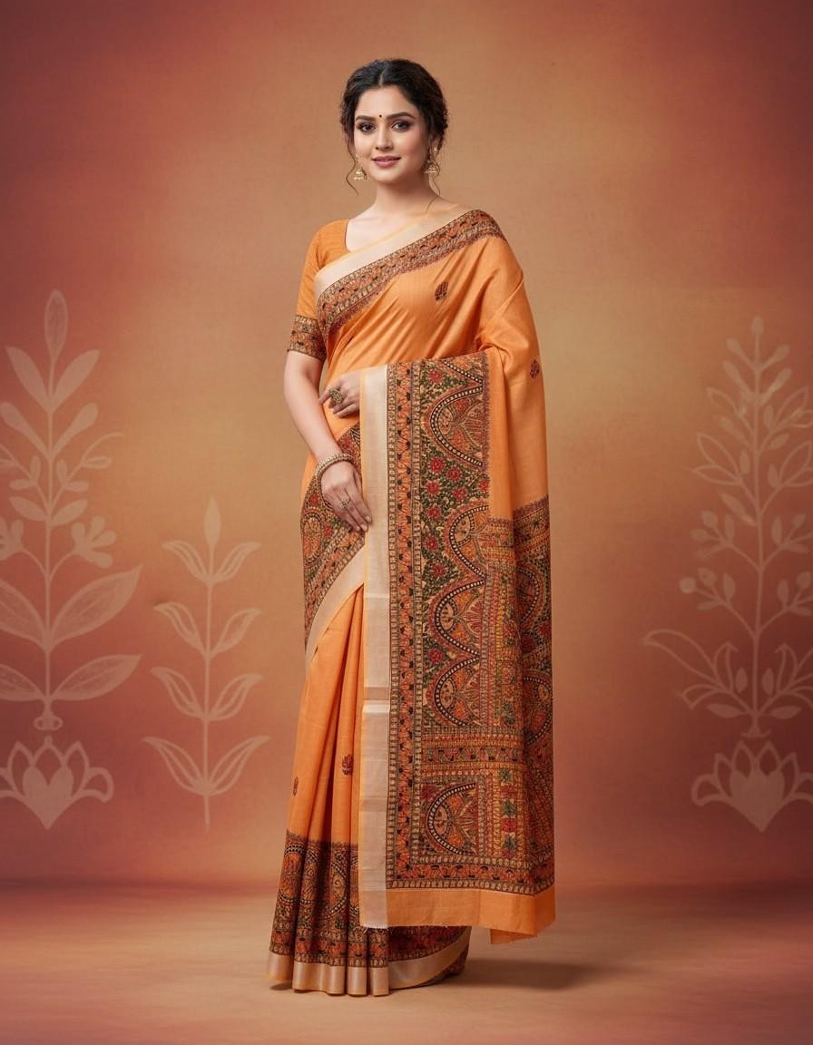 Kesarimayura Orange Hue Hand painted Madhubani Blend Saree
