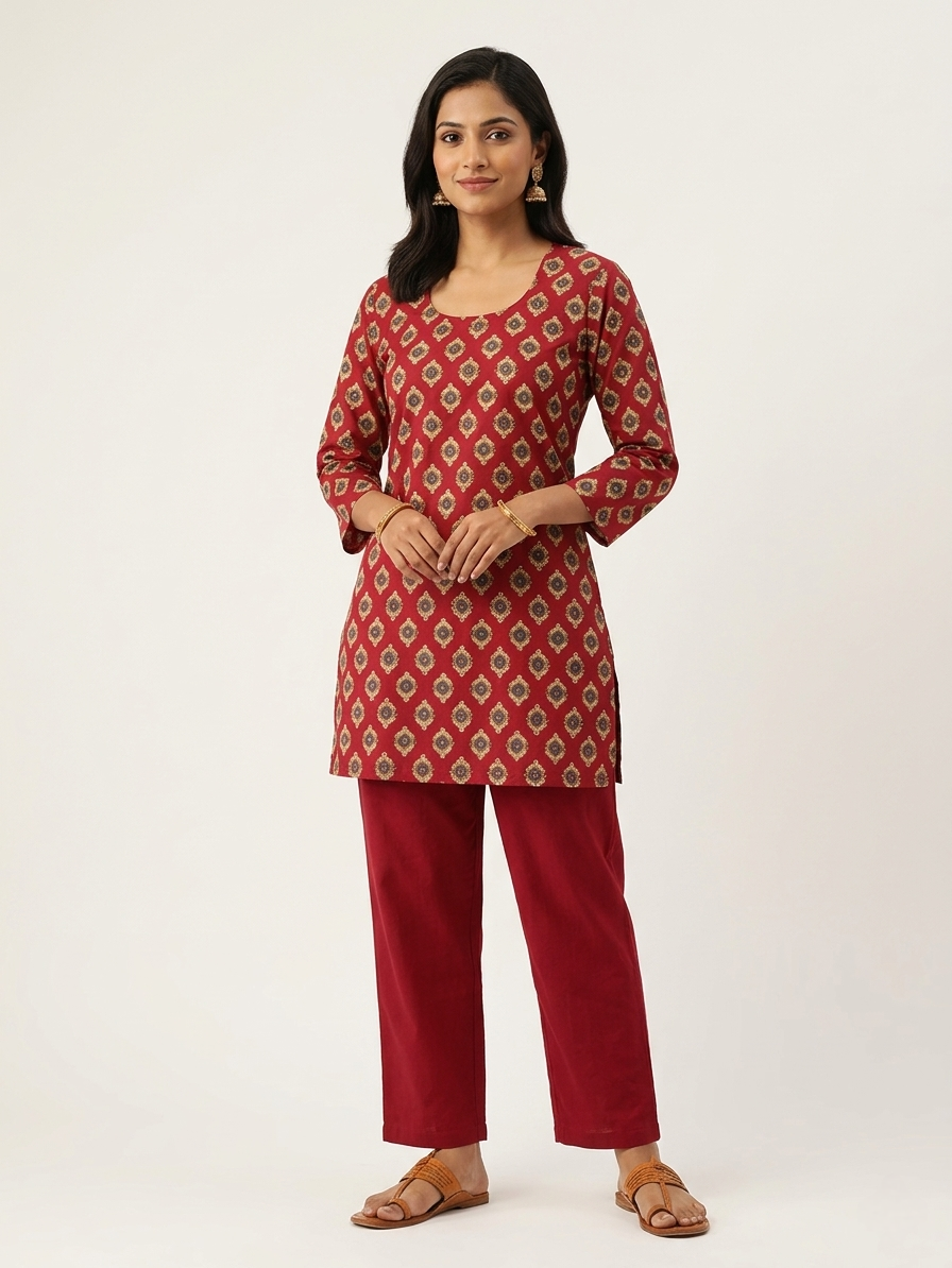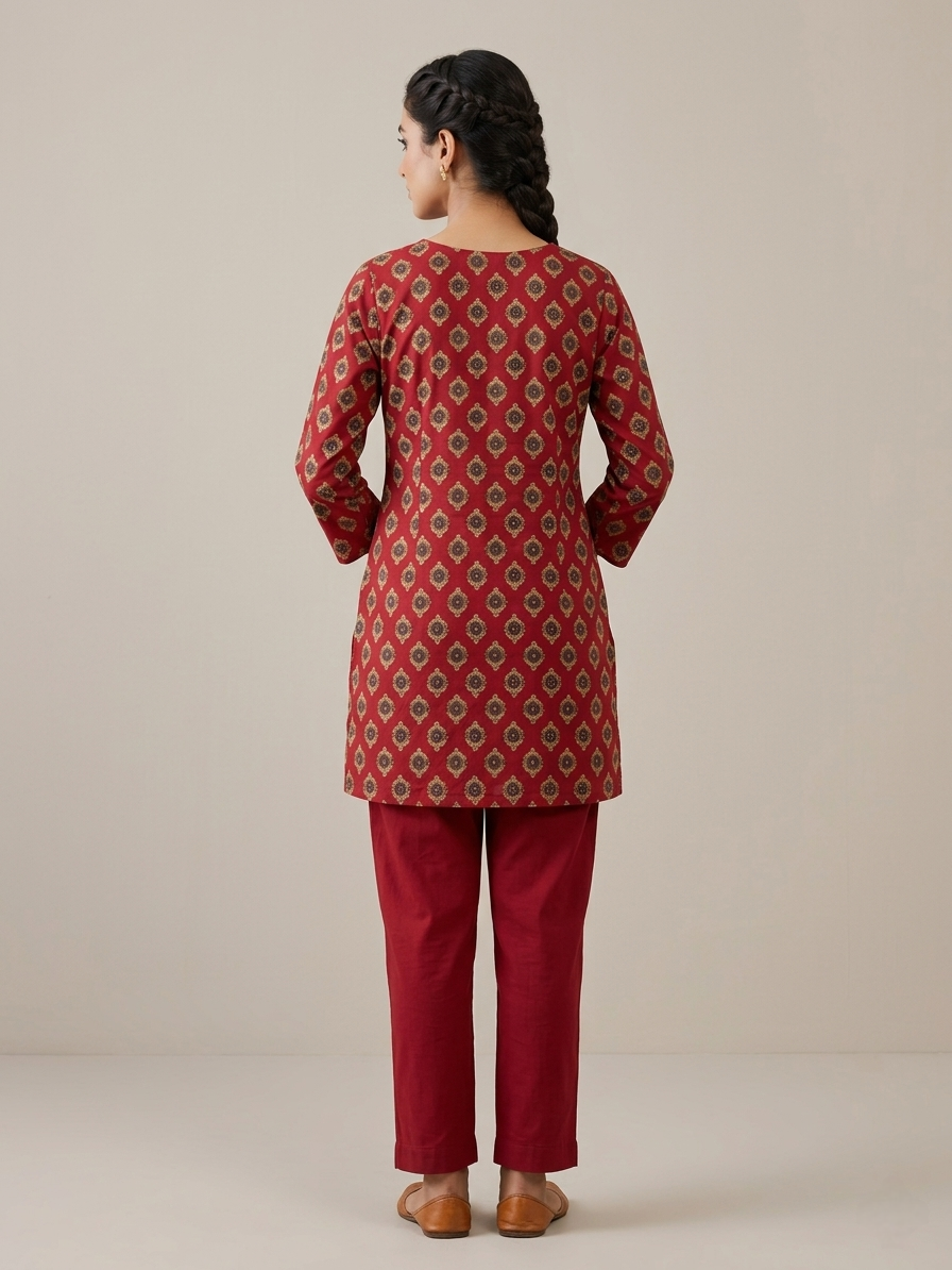 - Print: The kurti is adorned with an all-over traditional geometric or ethnic "buti" print. The pattern consists of diamond-shaped motifs in shades of beige and black, which stand out beautifully against the deep red base.