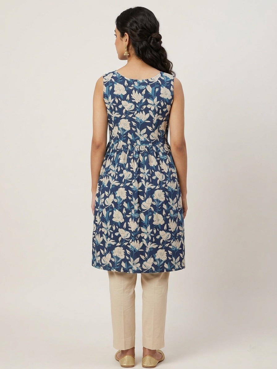 This ladies' short cotton kurti features a chic, sleeveless design with a vibrant botanical theme.