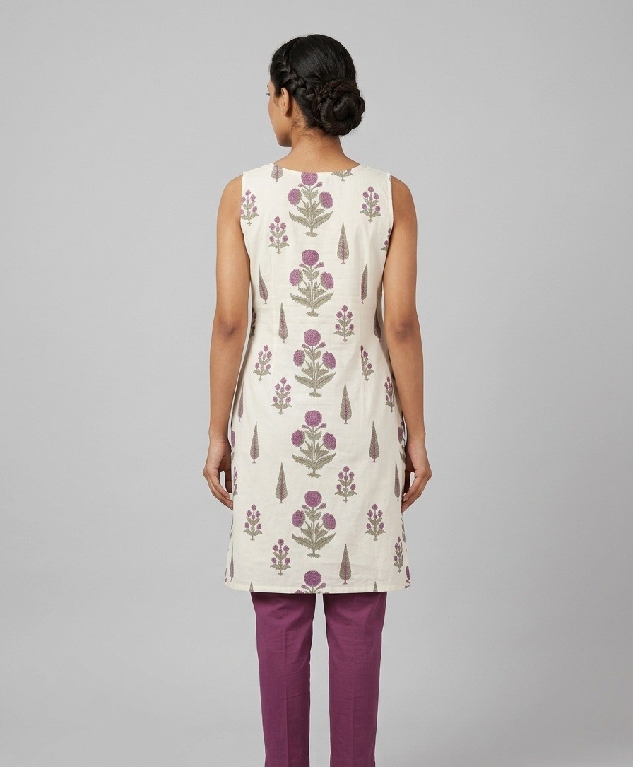 - Pattern: It is adorned with Sanganeri-style floral block prints. The motifs feature a soft lavender/mauve color for the petals and a muted sage green for the leaves and stems.