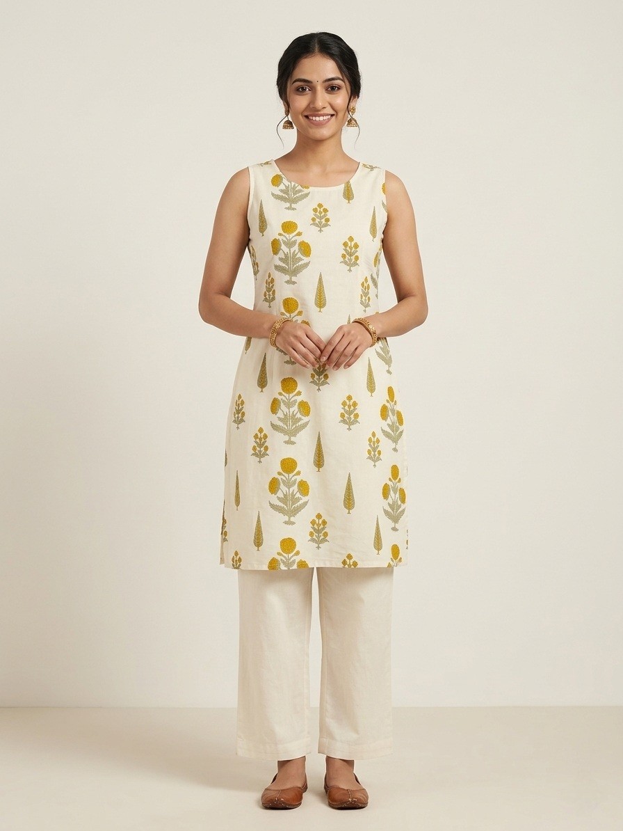 - Styling Suggestion: In the image, it is paired with matching off-white wide-leg trousers and tan mojaris (traditional flats). Gold bangles and small jhumkas complete the look with a touch of ethnic elegance.