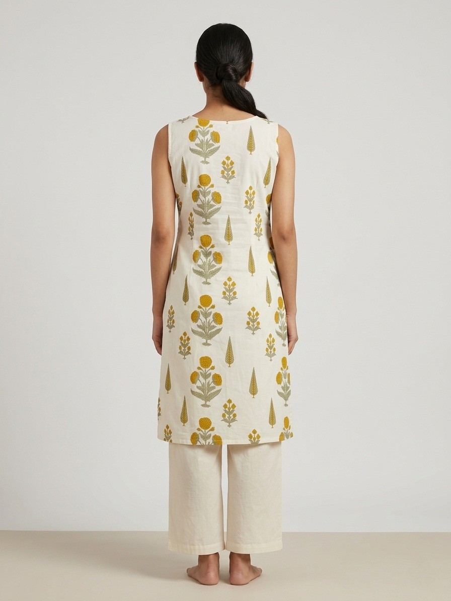 - Base Color: The kurti is set against a crisp off-white or ivory background, which makes the print pop.