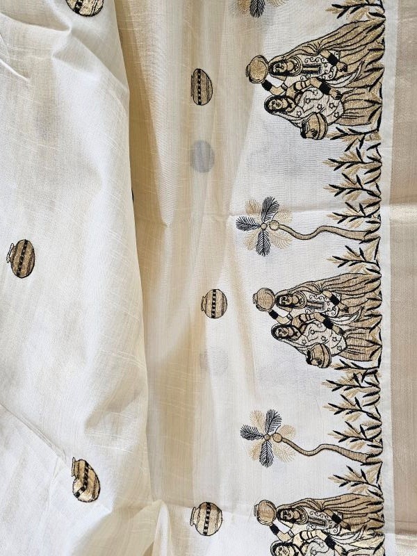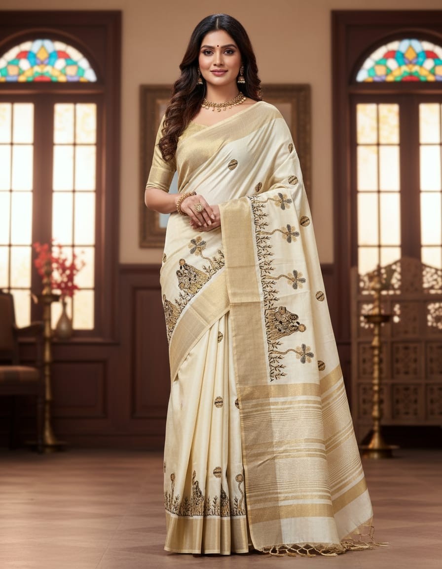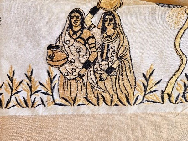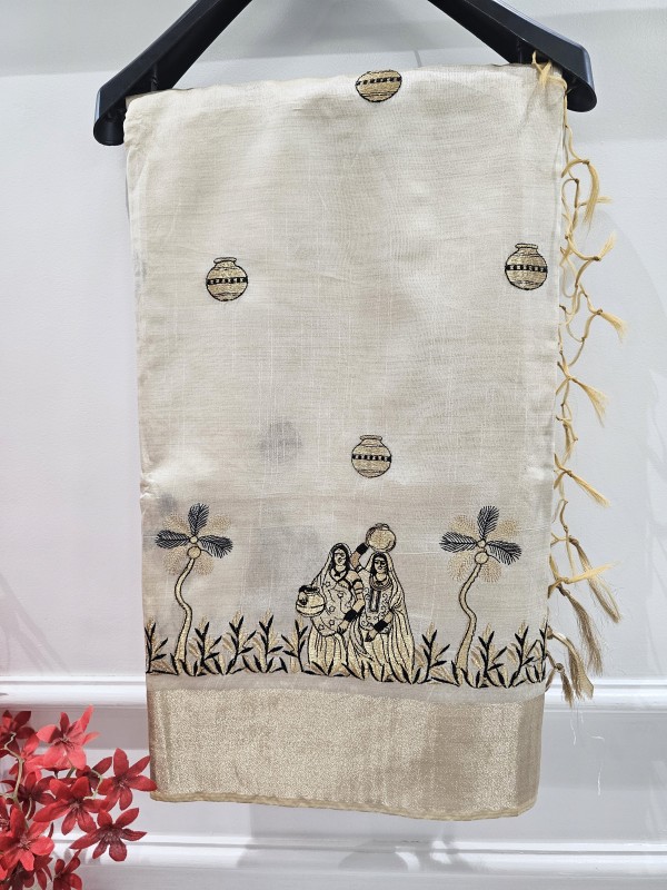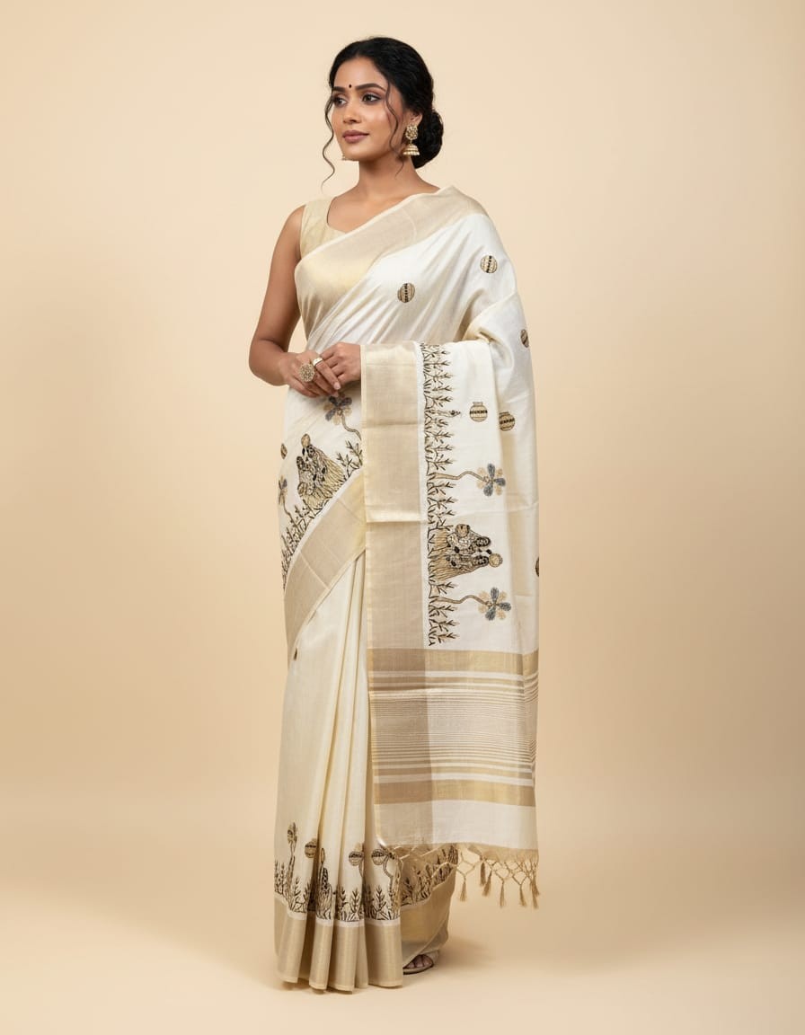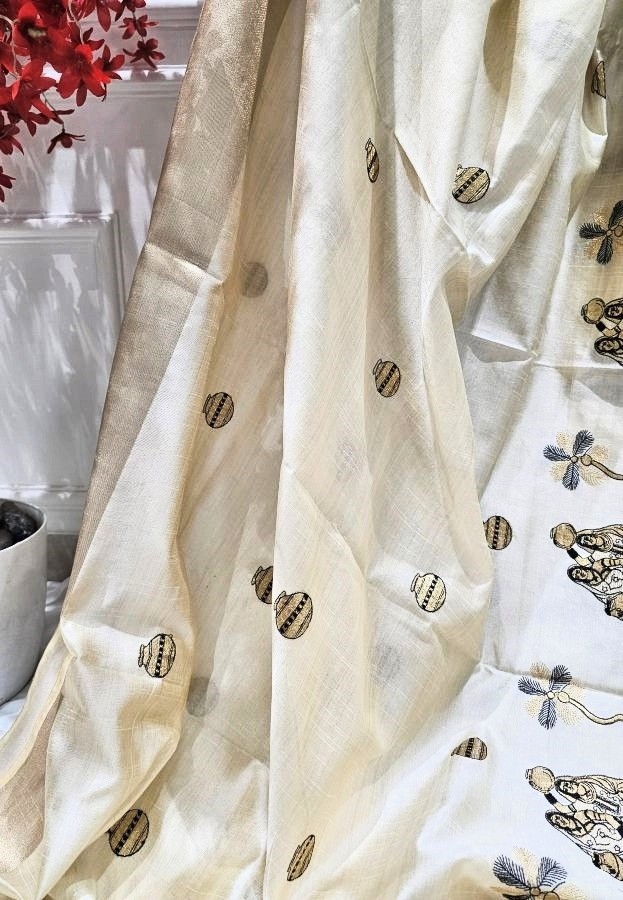 Embrace tradition and everyday elegance with our Lady with Mataka Motif Semi Tussar Saree. Crafted from soft and airy semi tussar silk, this saree features hand-drawn motifs of village women carrying matakas (water pots) — a timeless symbol of grace, strength, and rural beauty. The intricate artwork reflects the rhythm of daily life and cultural heritage, while the natural sheen of tussar silk adds a subtle richness. Ideal for art lovers and heritage admirers, this saree is perfect for cultural events and thoughtful gifting.