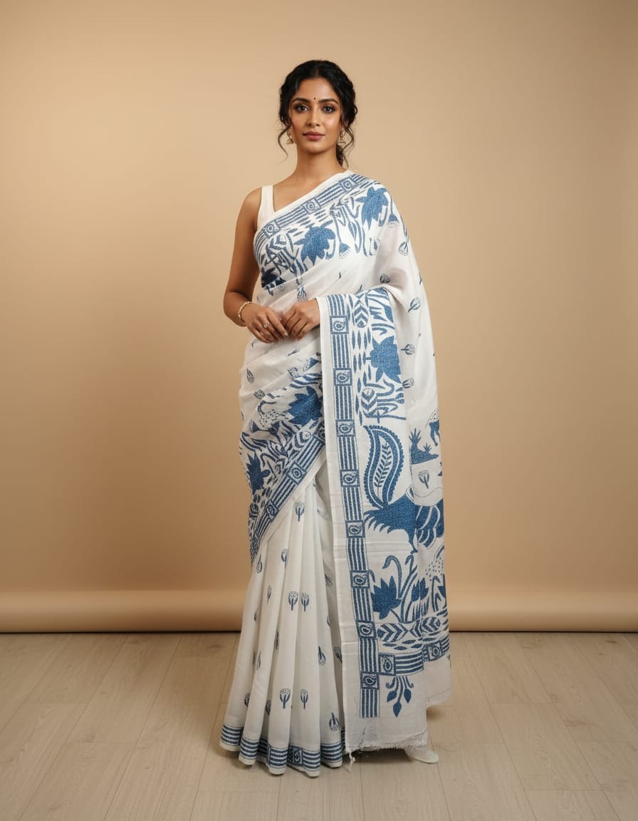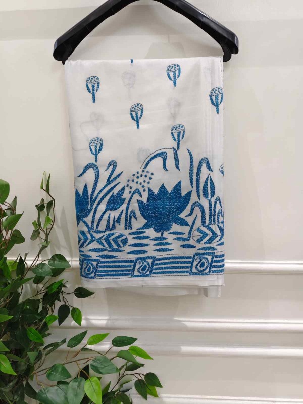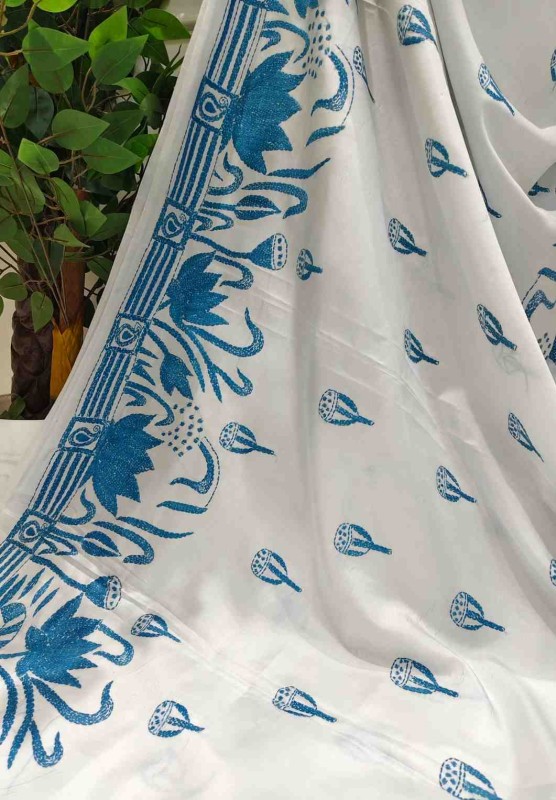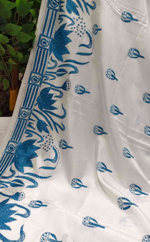 Lotus Lagoon on white Bangalore Silk Kantha Saree