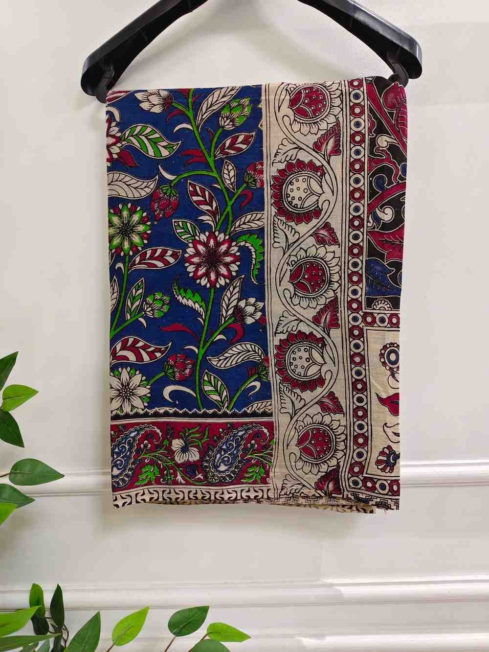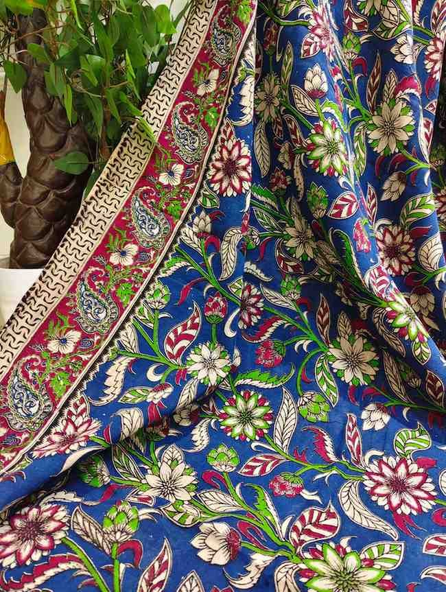 'Madhavilatika' Bold Blue canvas with Floral and Leaf motifs cotton Kalamkari Saree