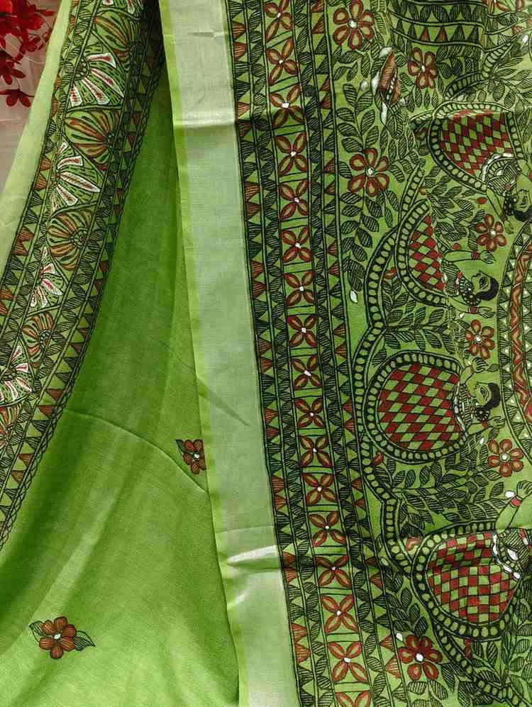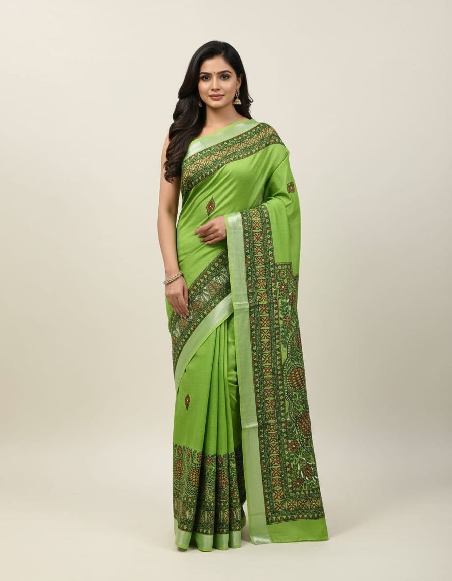 Unveil the charm of traditional artistry with the Madhu nritya Forest Green Hand painted Madhubani Blend Saree . This exquisite saree features a delicate Green base, which beautifully contrasts with the vibrant Madhubani hand-painted motifs. Inspired by nature and folklore, the art tells a story of elegance and grace. The human motif, with its unique color palette and intricate detailing, is a testament to the skilled craftsmanship of Madhubani artisans. Whether worn at weddings, cultural festivals, or special events, this saree is a perfect blend of tradition and contemporary elegance.