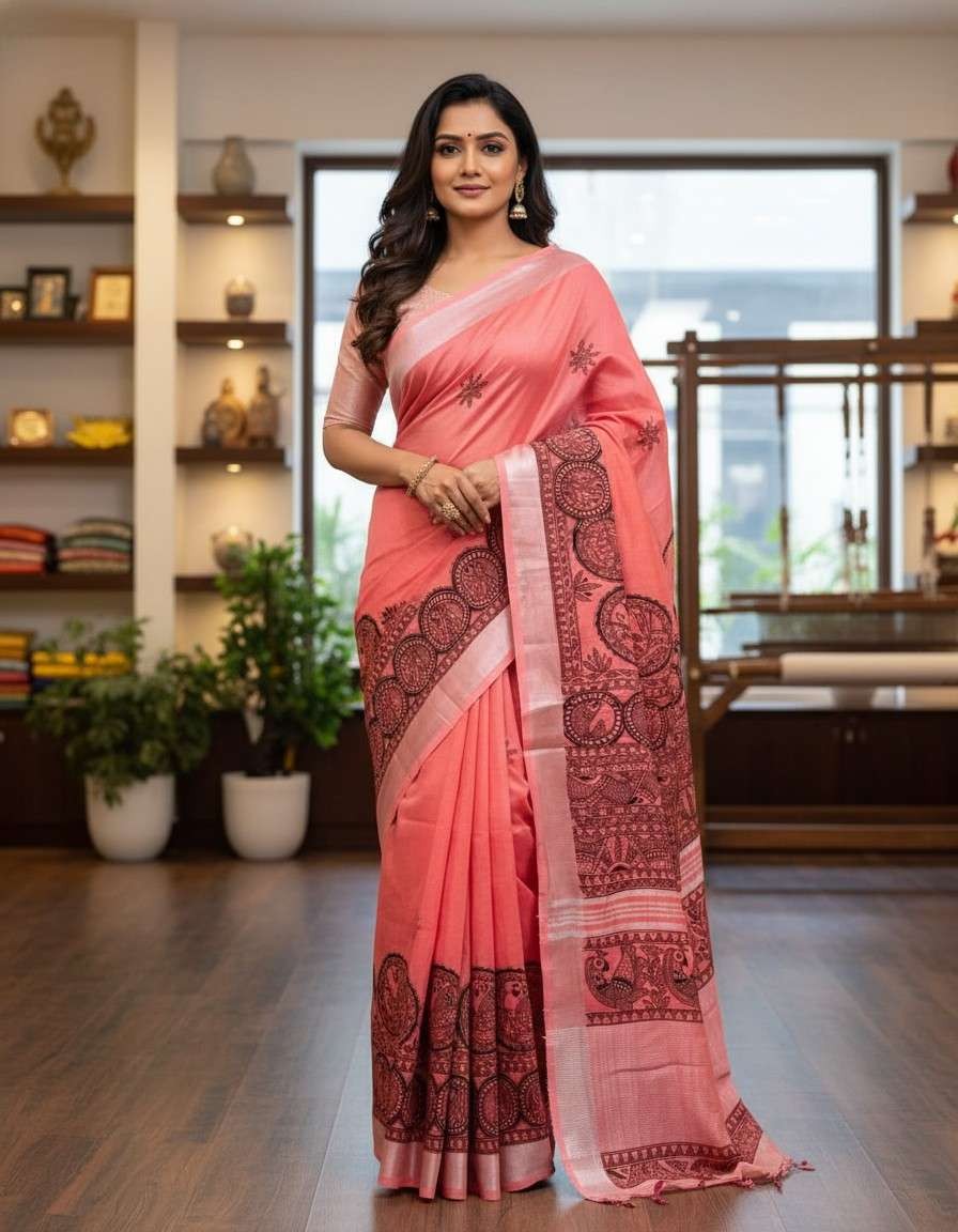 Celebrate the artistry of traditional craftsmanship with the MANORATH' Pink Hand painted Madhubani Blend Saree. The soft, delicate pink base of the saree serves as a perfect backdrop for the vibrant Madhubani hand-painting motifs that adorn it. The intricate designs, rich in symbolism and storytelling, feature a beautiful fusion of natural elements, folklore, and geometric patterns. This saree is ideal for weddings, cultural events, and special occasions, where you can express both your love for tradition and your refined sense of style.