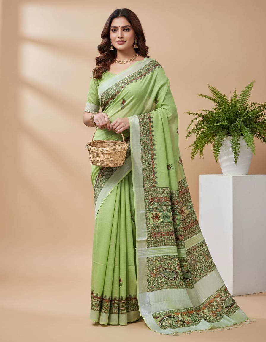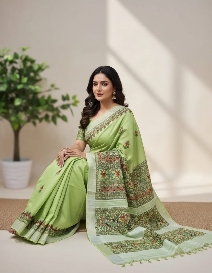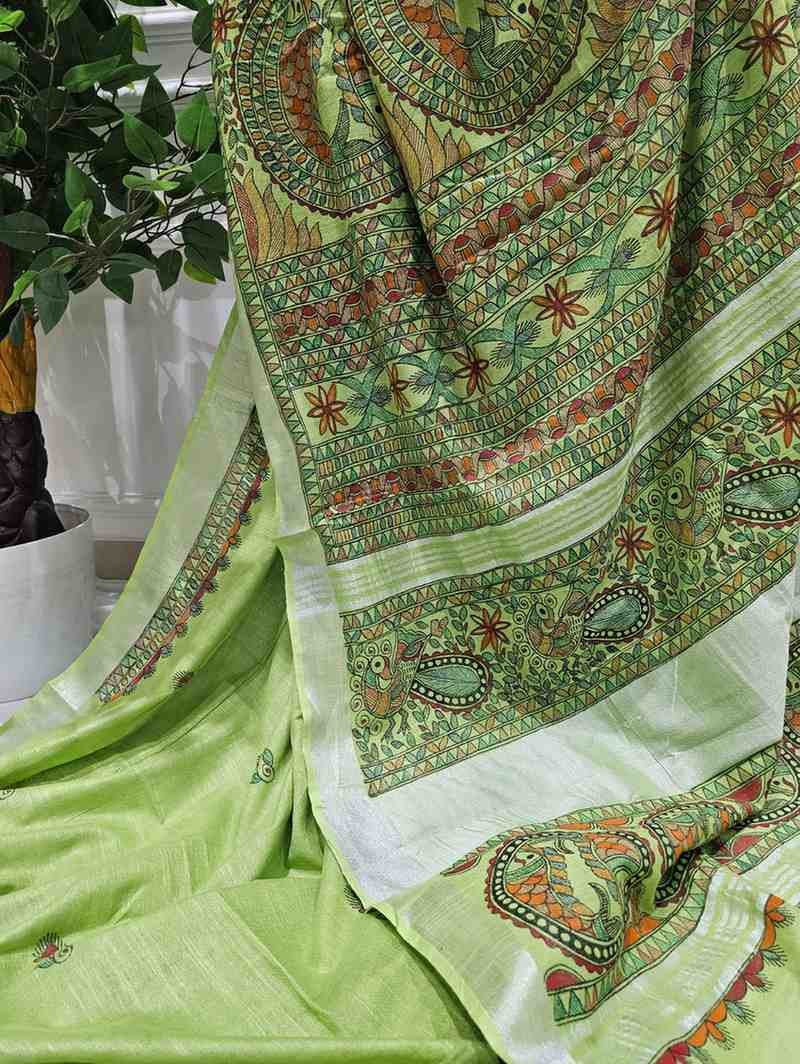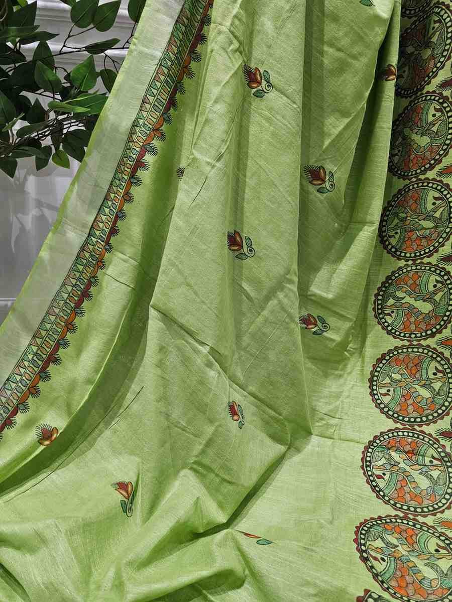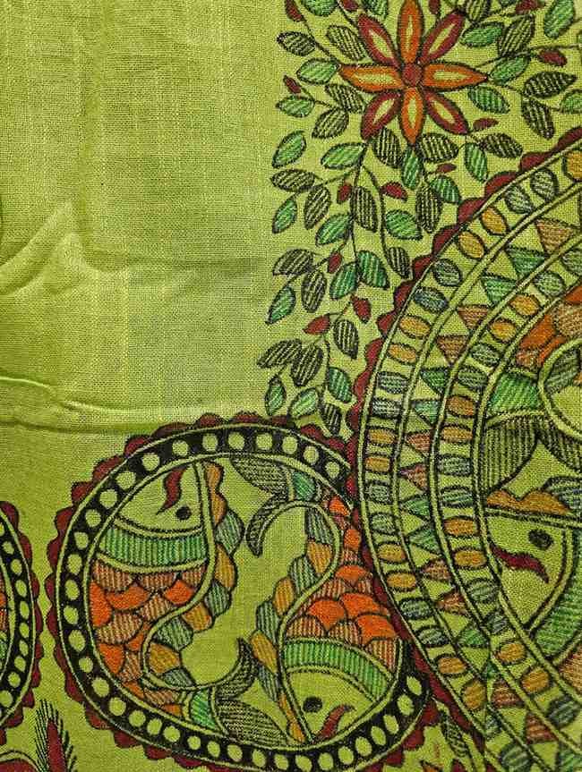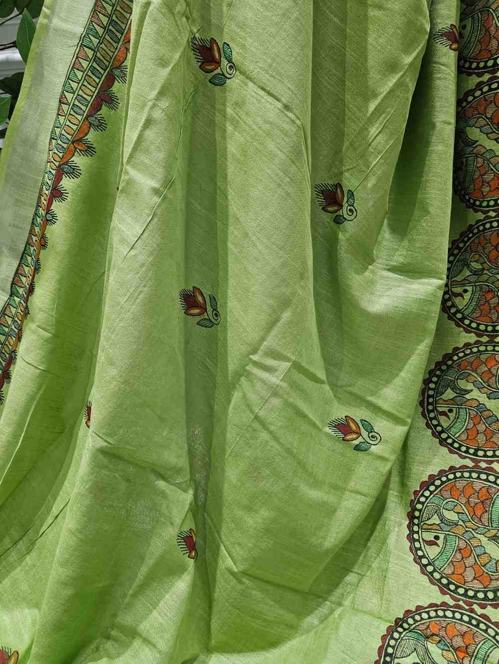 Matsya Leela Mint Green Hand painted Madhubani Blend Saree