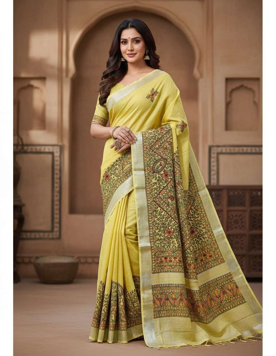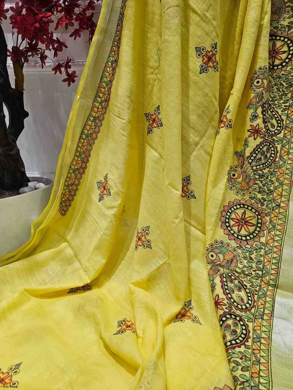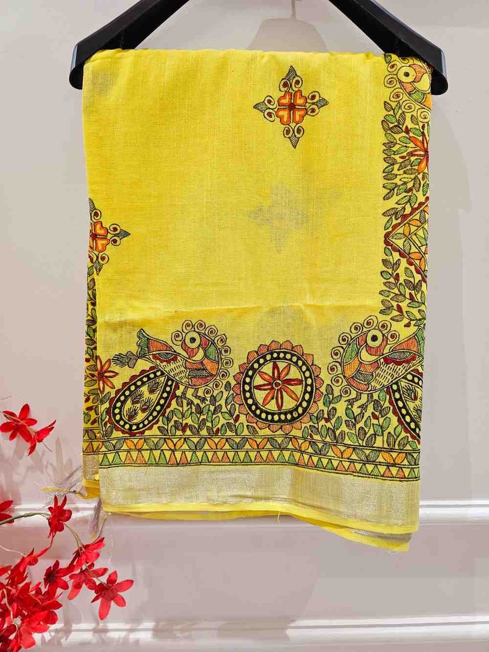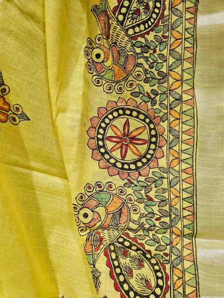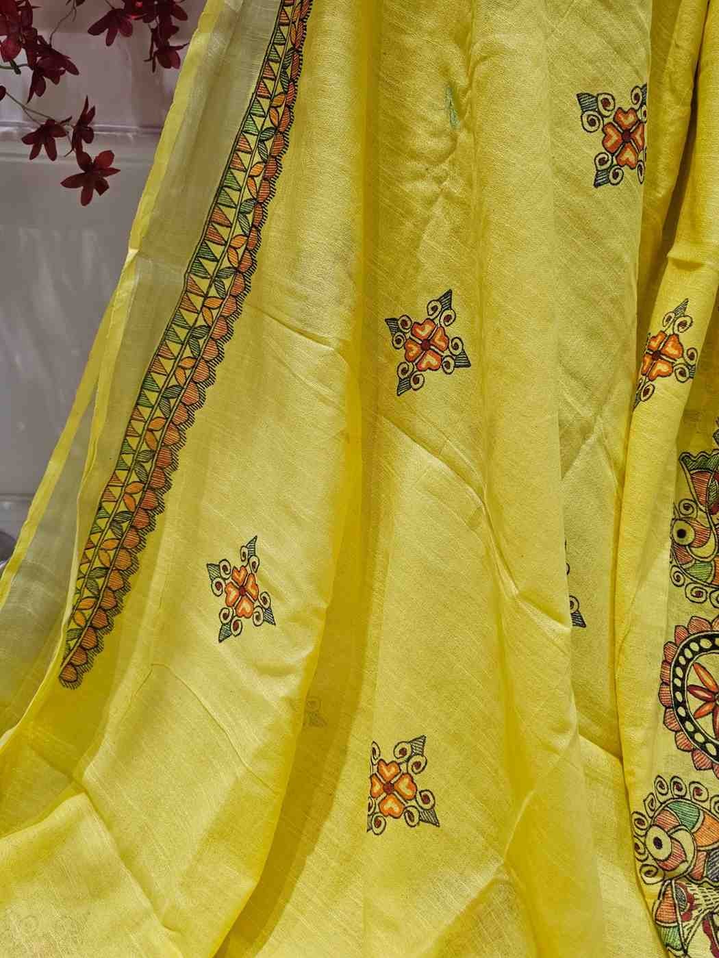 Mayurvan Yellow Hand painted Madhubani Blend Saree