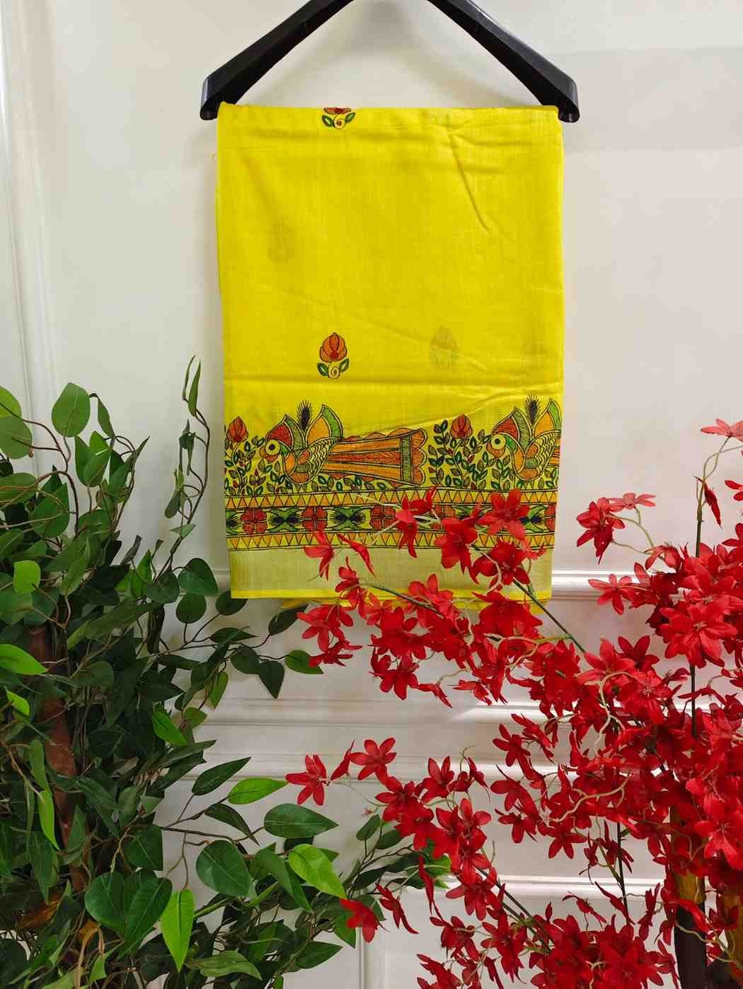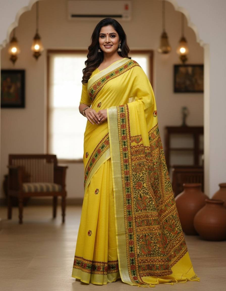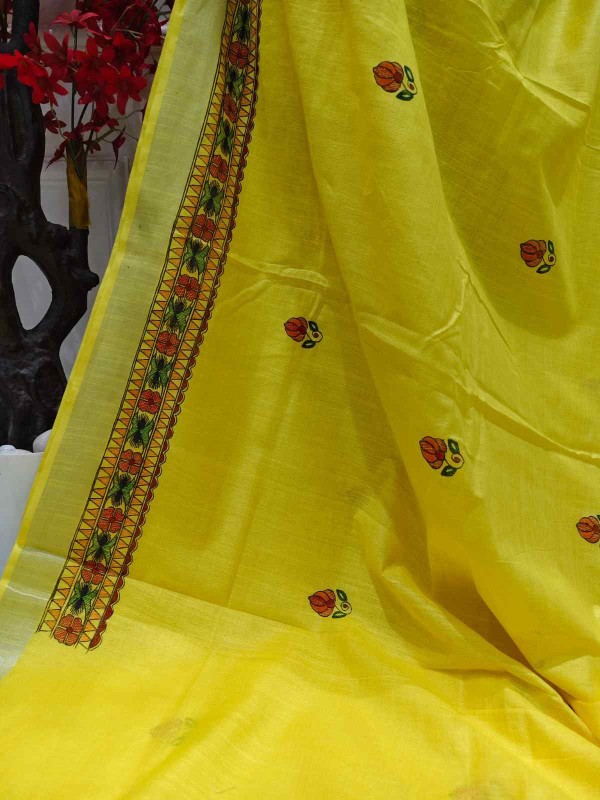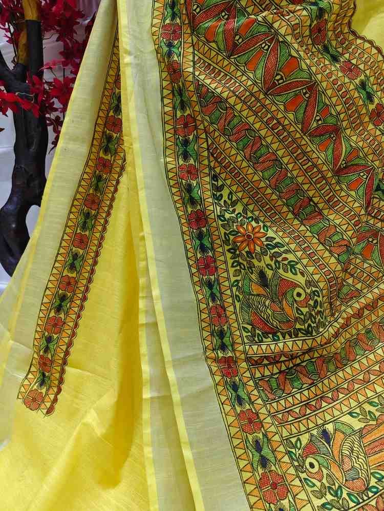 Menmayuri Yellow hand painted Madhubani Blend Saree