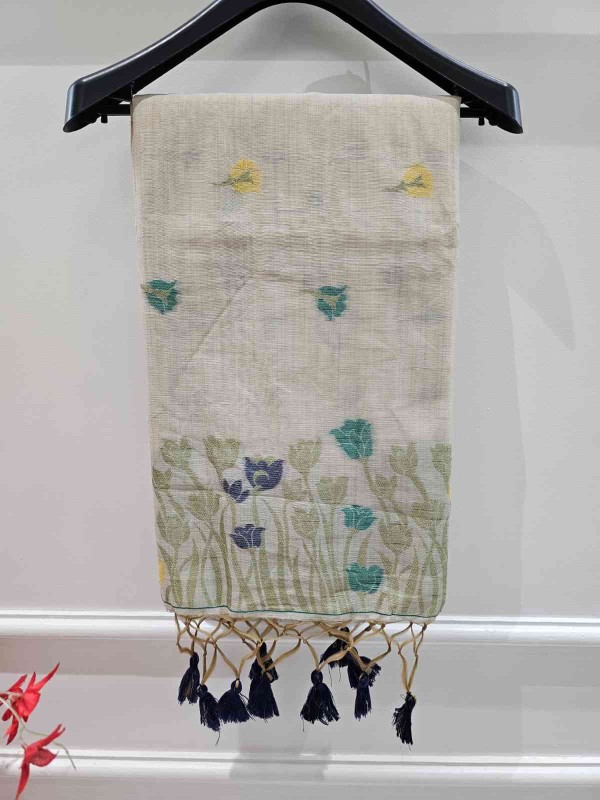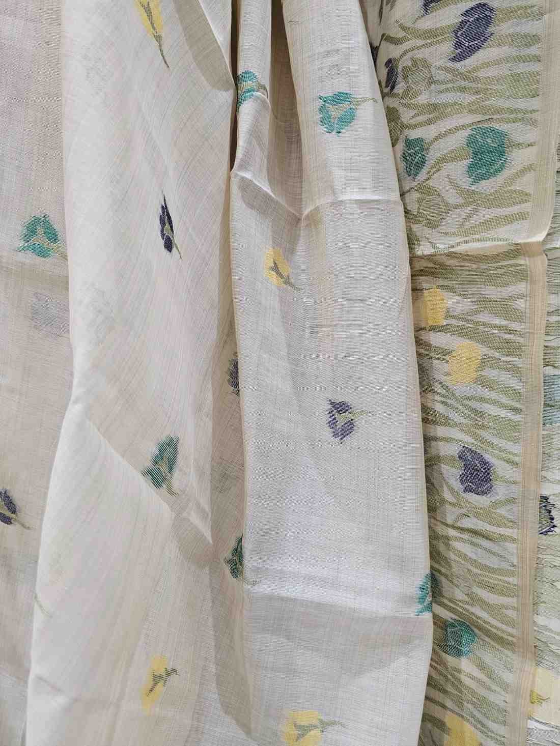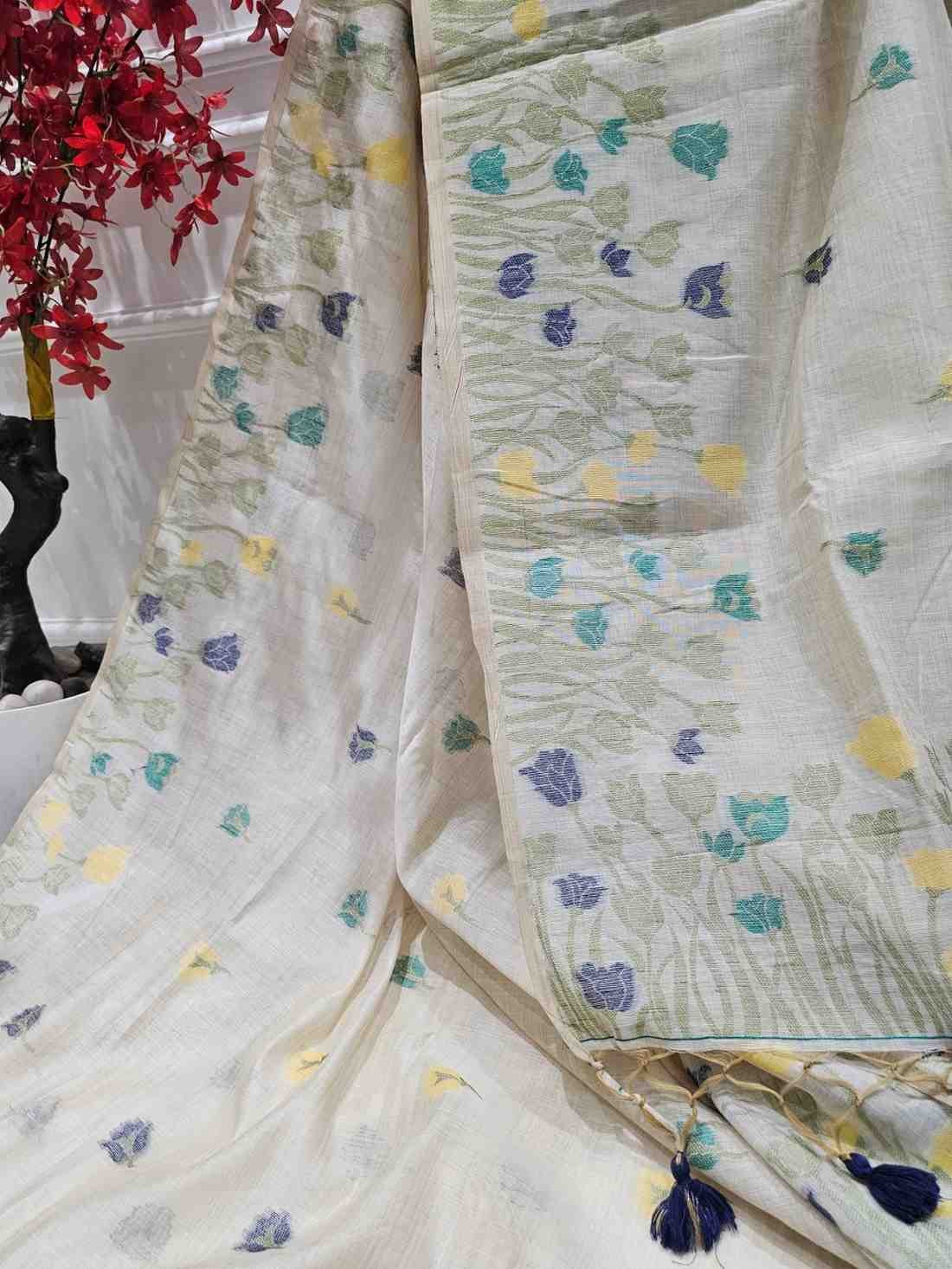 Muga Assam Silk - Off White with Berry Sapphire Floral Bloom
