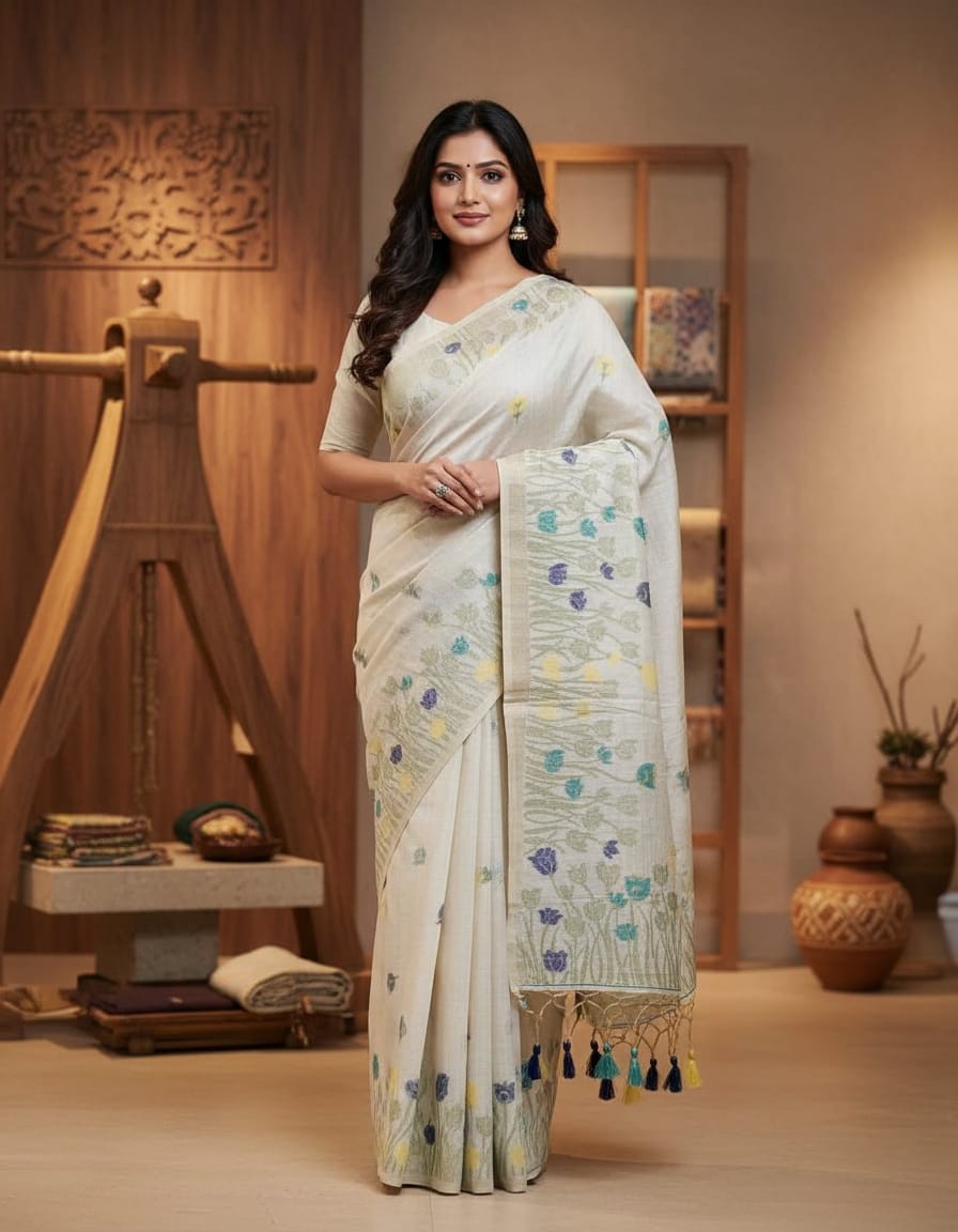 Celebrate the harmony of nature and craftsmanship with our Muga Assam Silk Saree, featuring a soft Off White base adorned with rich Berry Sapphire Floral Blooms. Woven from the finest Muga silk, this saree offers a luxurious sheen and exquisite texture, reflecting the timeless elegance of traditional Assamese weaving. The berry sapphire floral motifs add a pop of color and sophistication, creating a perfect contrast against the off-white base. Ideal for weddings, cultural celebrations, and festive occasions, this saree combines the artistry of handloom weaving with modern beauty, making it a standout choice for any special event.
