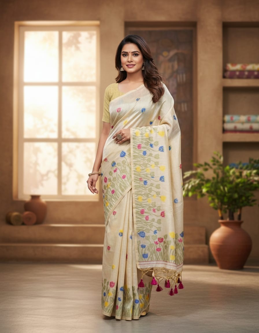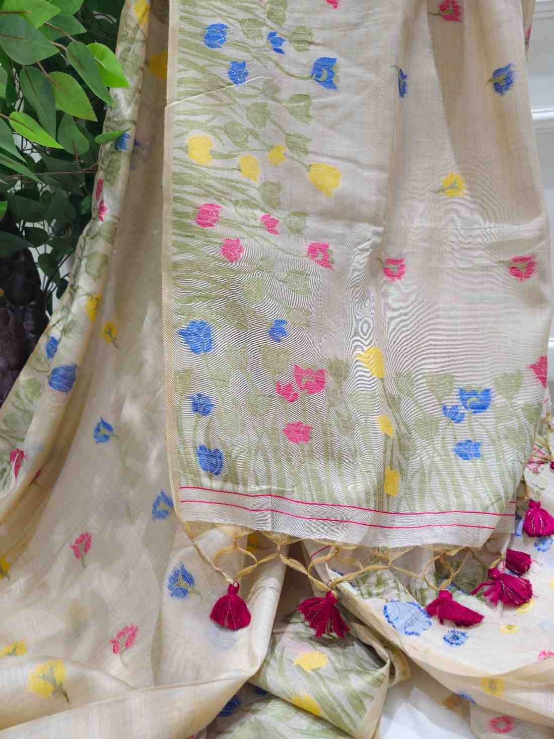 Embrace the beauty of tradition with our Off White Muga Assam Silk Saree, featuring stunning Magenta Lapis Floral Bloom motifs. Woven from the finest Muga silk, this saree captures the natural golden sheen and luxurious texture that is the hallmark of Assamese craftsmanship. The serene off-white base, combined with vibrant magenta and lapis floral blooms, creates a captivating contrast that adds richness and sophistication. Perfect for weddings, festive celebrations, or cultural gatherings, this saree embodies timeless elegance and is sure to make a lasting impression.
