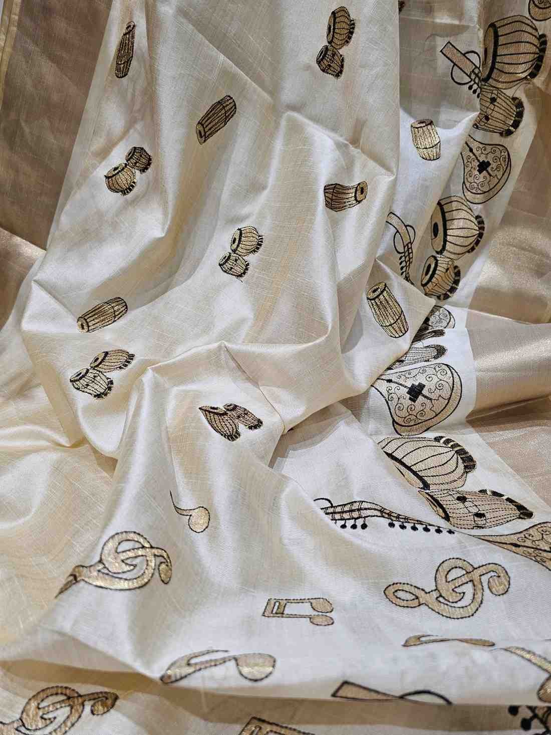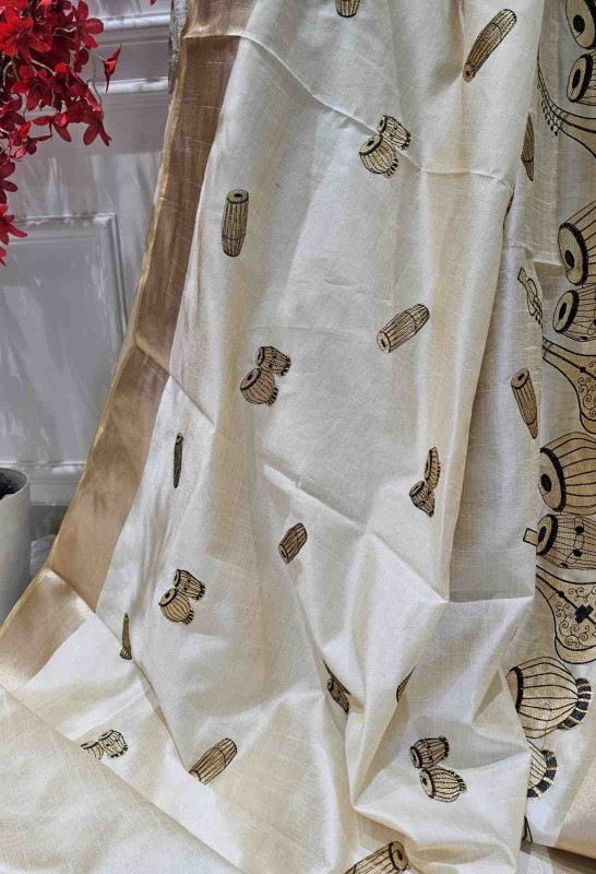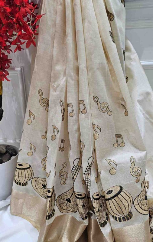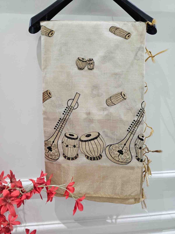 Let your style sing with the enchanting Musical Motif Semi Tussar Saree. Woven from lightweight and textured semi tussar silk, this saree features beautifully illustrated musical instrument motifs that capture the soul of Indian classical traditions. Each motif is delicately hand-drawn, paying homage to the rhythm and melody that define our cultural roots. The natural luster of tussar silk complements the artistic detailing, making this saree a graceful choice for concerts, festive evenings, or cultural gatherings.