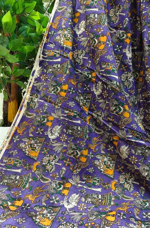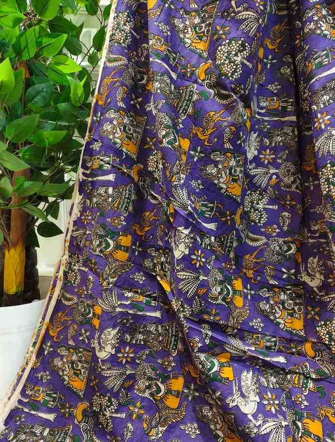 'Narikatika' Purple canvas with Trees and Human motifs cotton Kalamkari Saree
