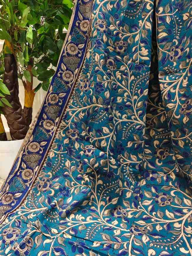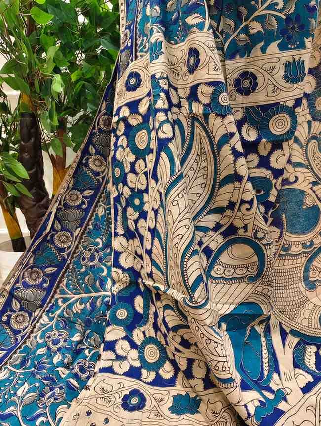 'Neelalata' Teal Blue canvas cotton Kalamkari Saree