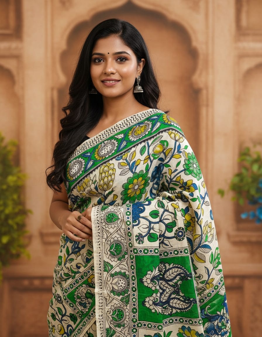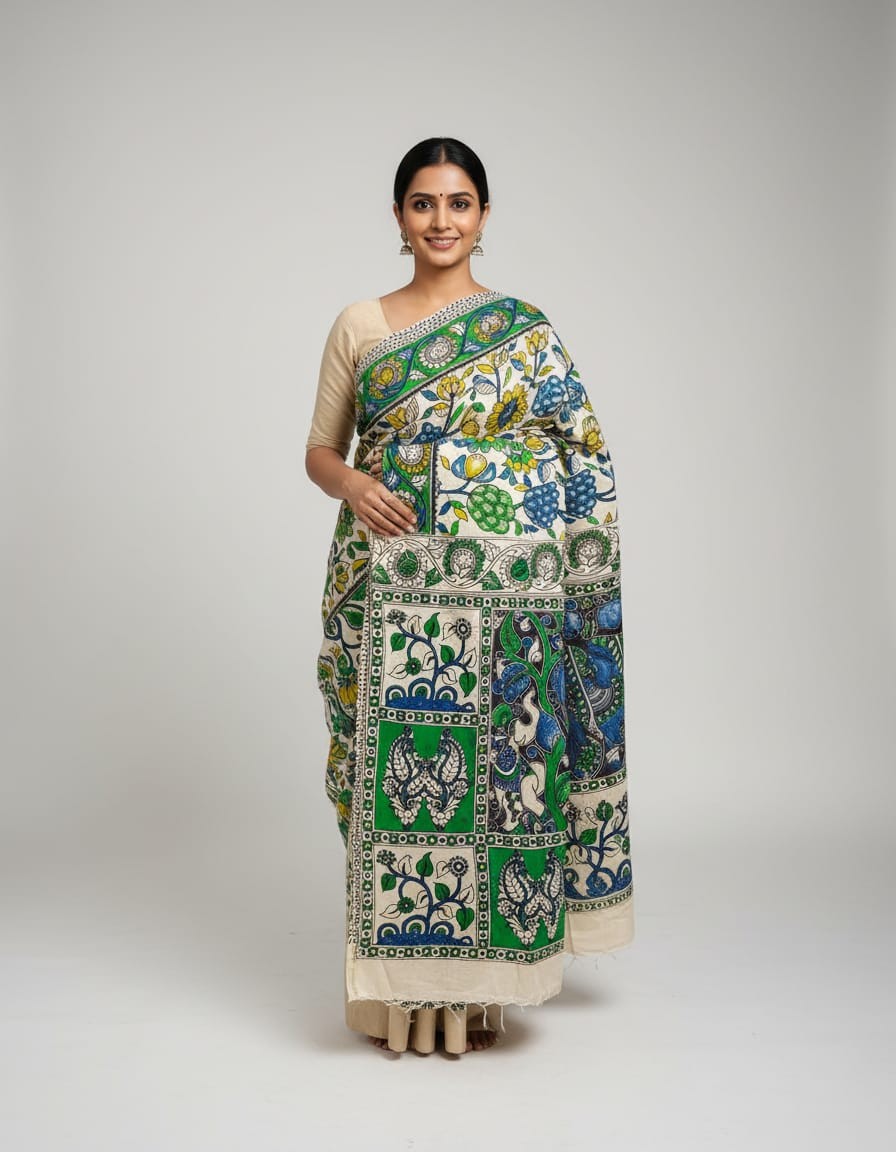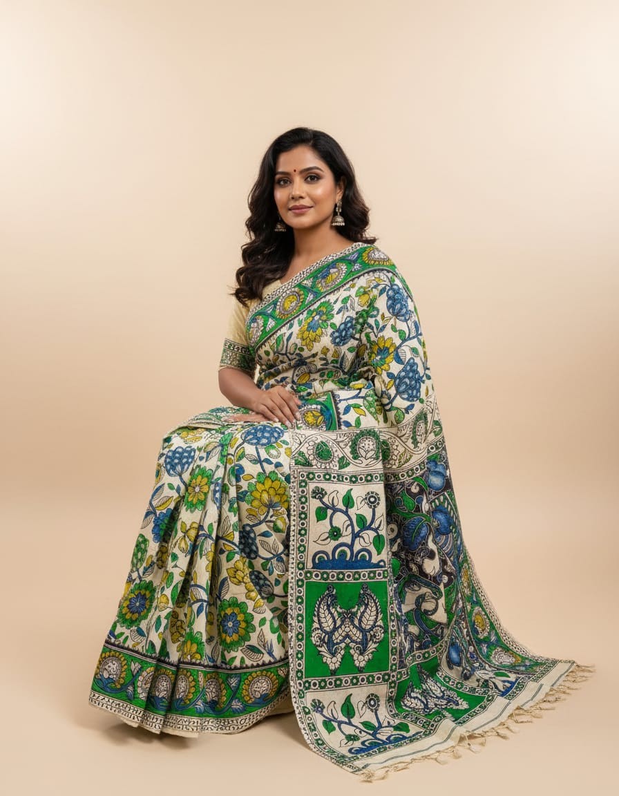 'Nilatarangini' Off White with Floral and Climber design cotton Kalamkari Saree