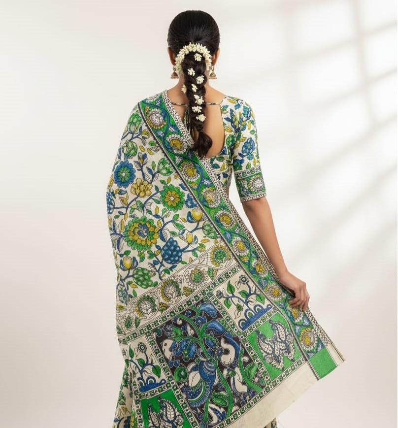 • Kalamkari sarees are sun-dried in open agricultural fields, which may result in minor dust marks — a testament to their authenticity. We recommend washing before first use.