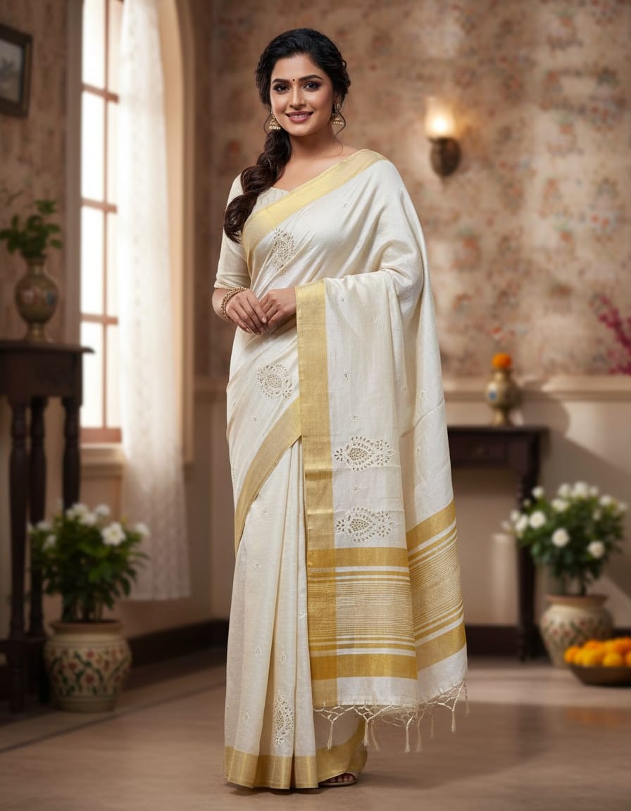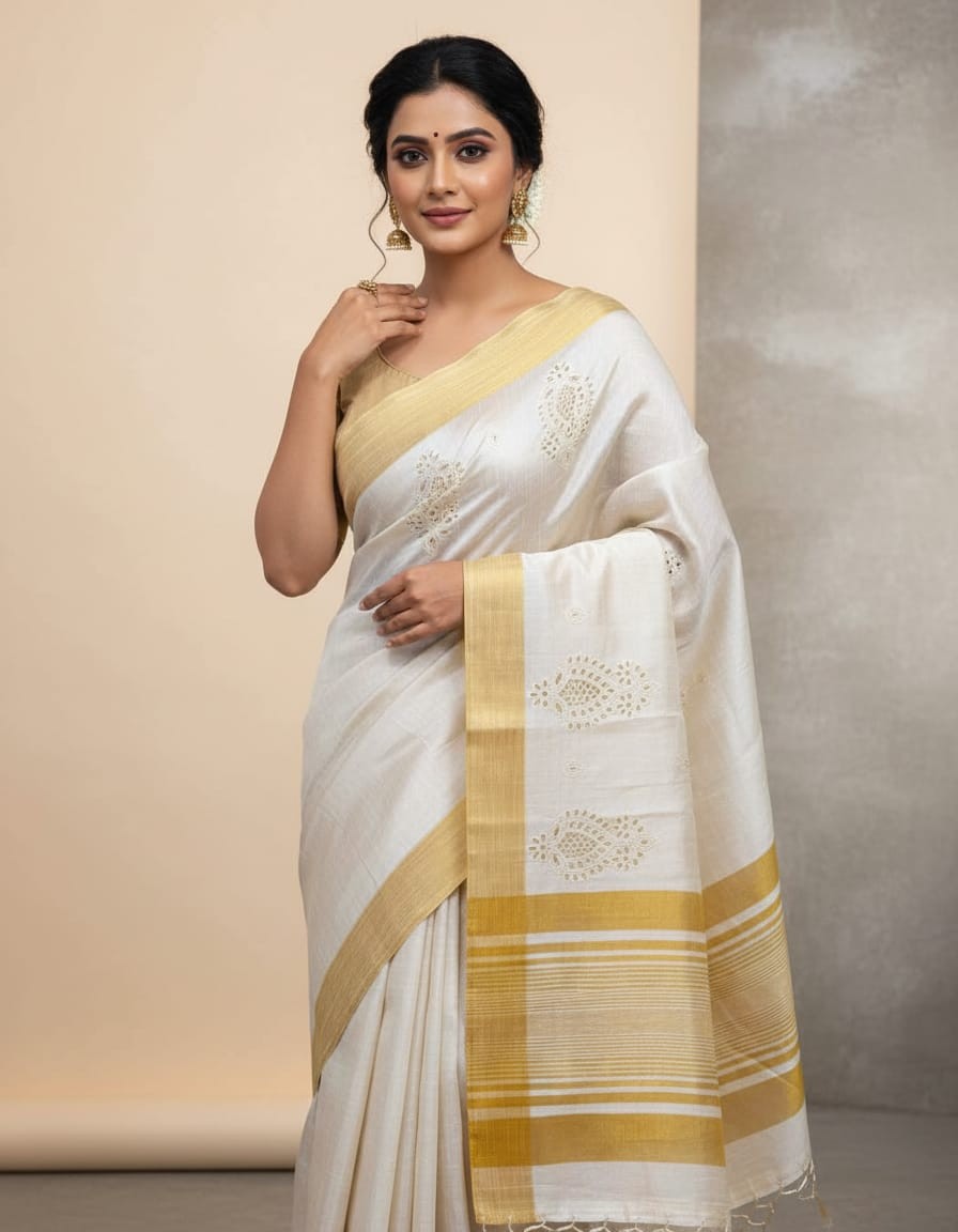 Color: Natural Matka Silk Base with Golden Border