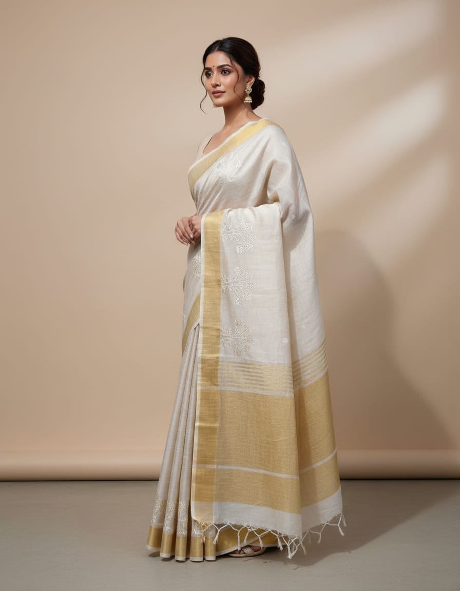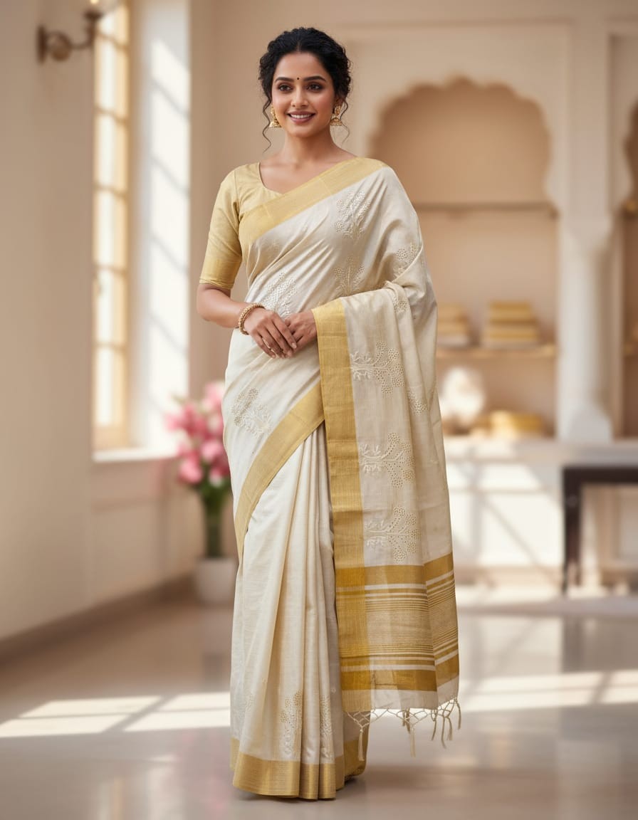 Color: Natural Matka Silk Base with Golden Border
