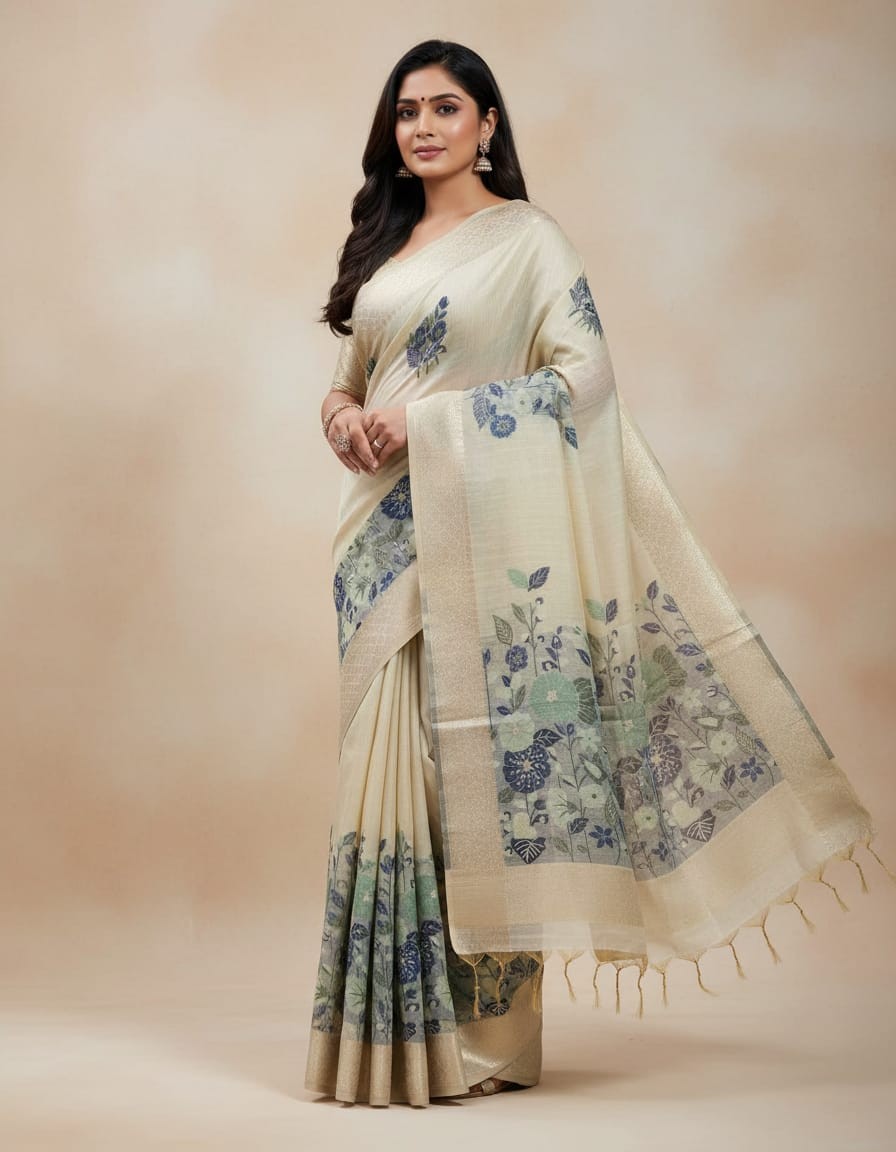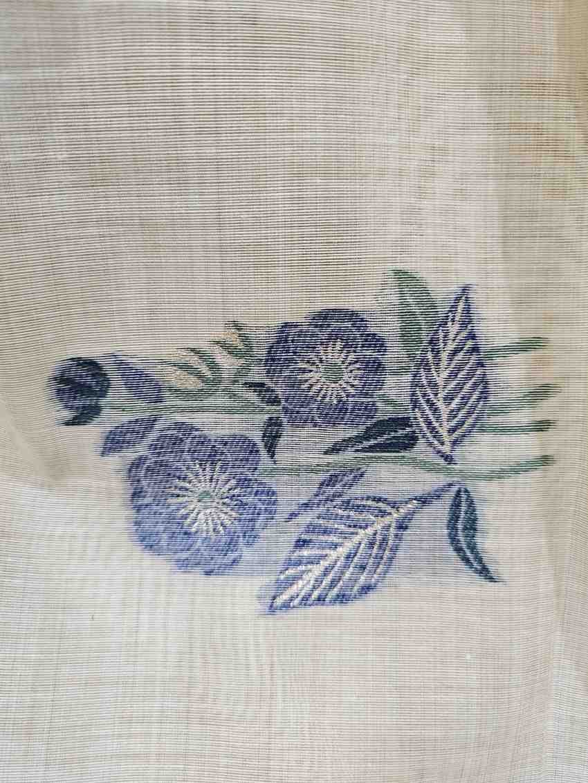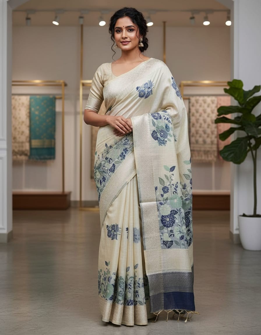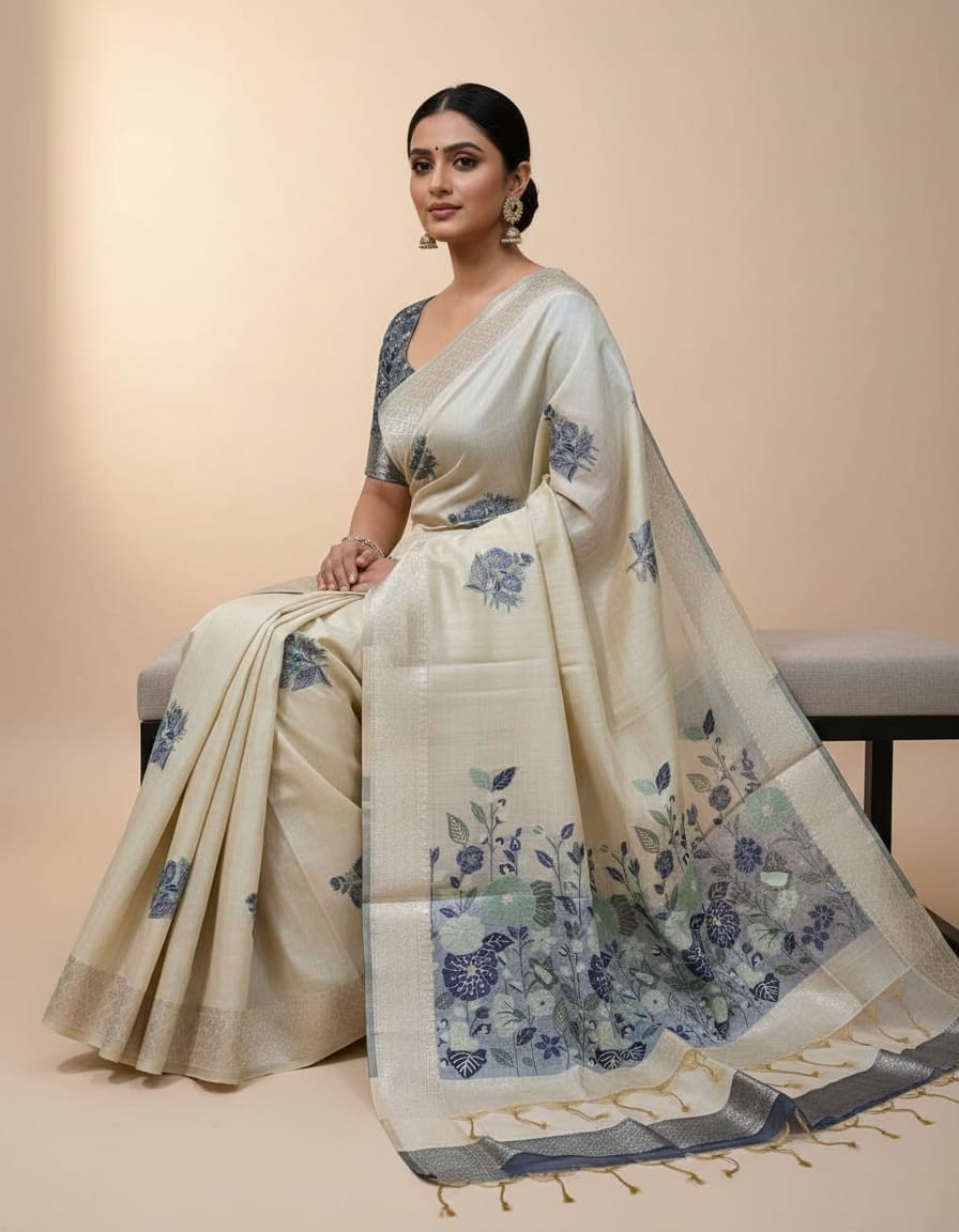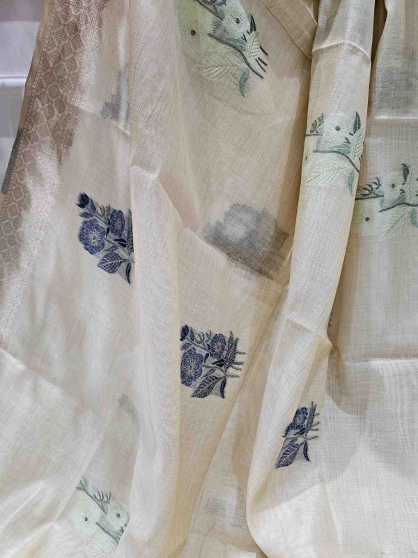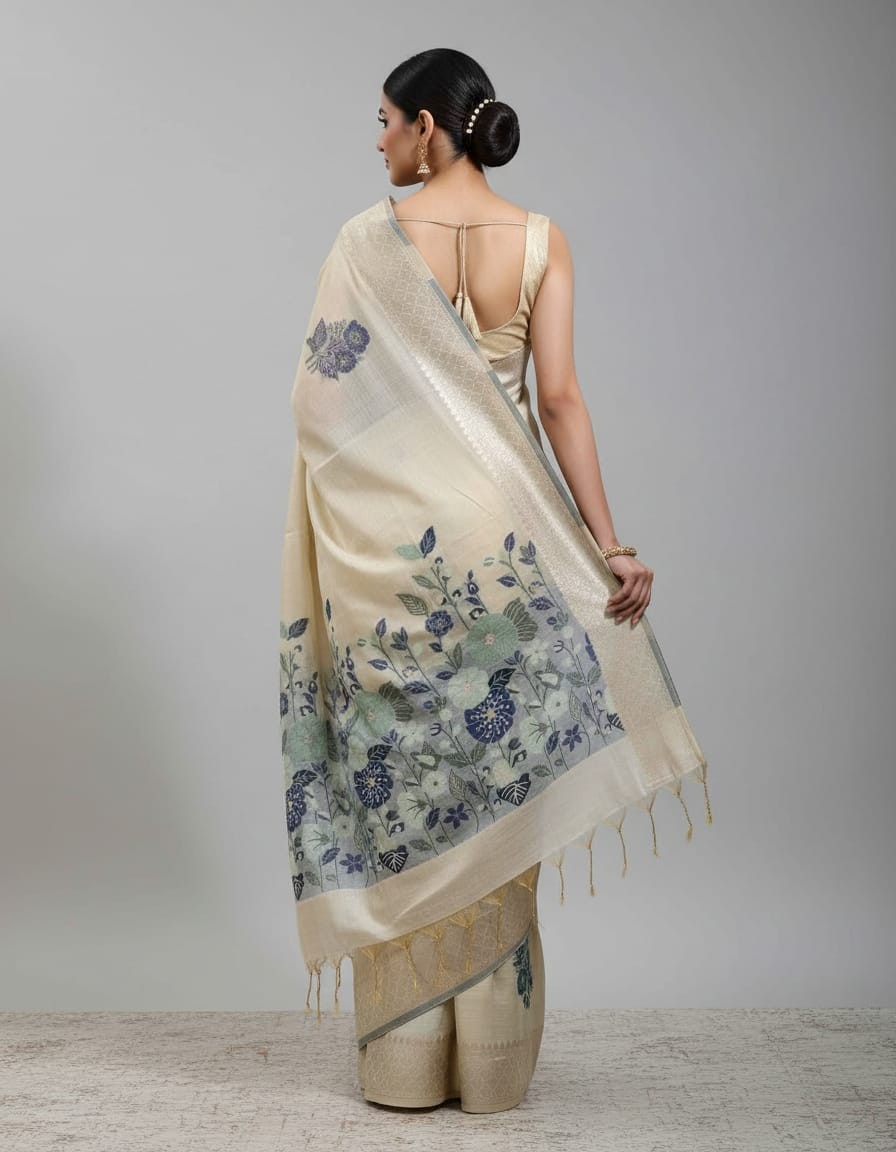 Off White Hue with Blue Floral Art Muga Jamdani Saree