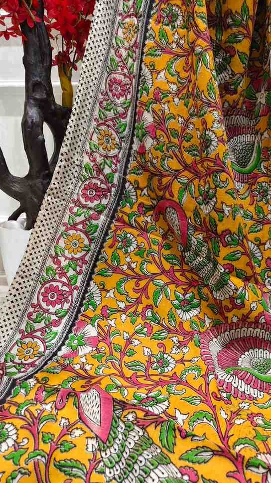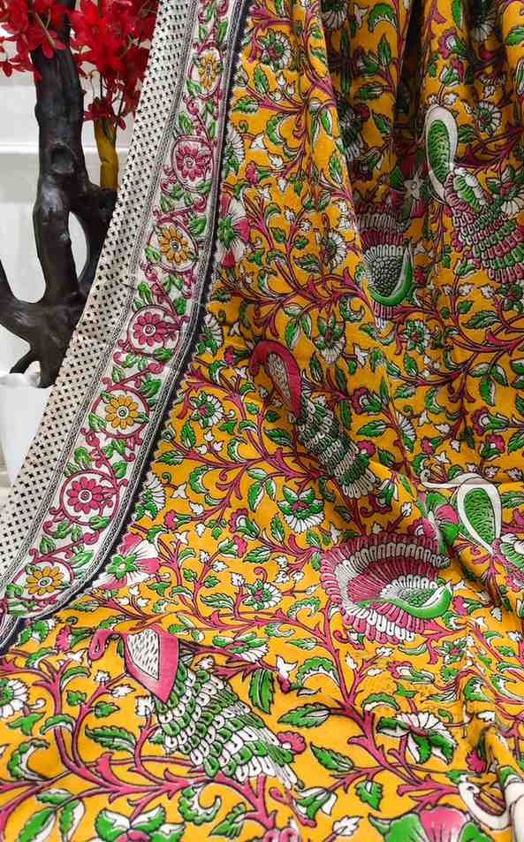 'Pakṣhiratna' Yellow canvas with Bird motifs cotton Kalamkari Saree
